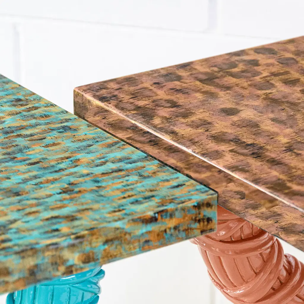 Side table with carved wood base, lacquered pink. The top is hand-painted wood with a high gloss finish. A touch of joyful colors to enlighten any living! This side table is a unique piece designed by G. Ventura.
