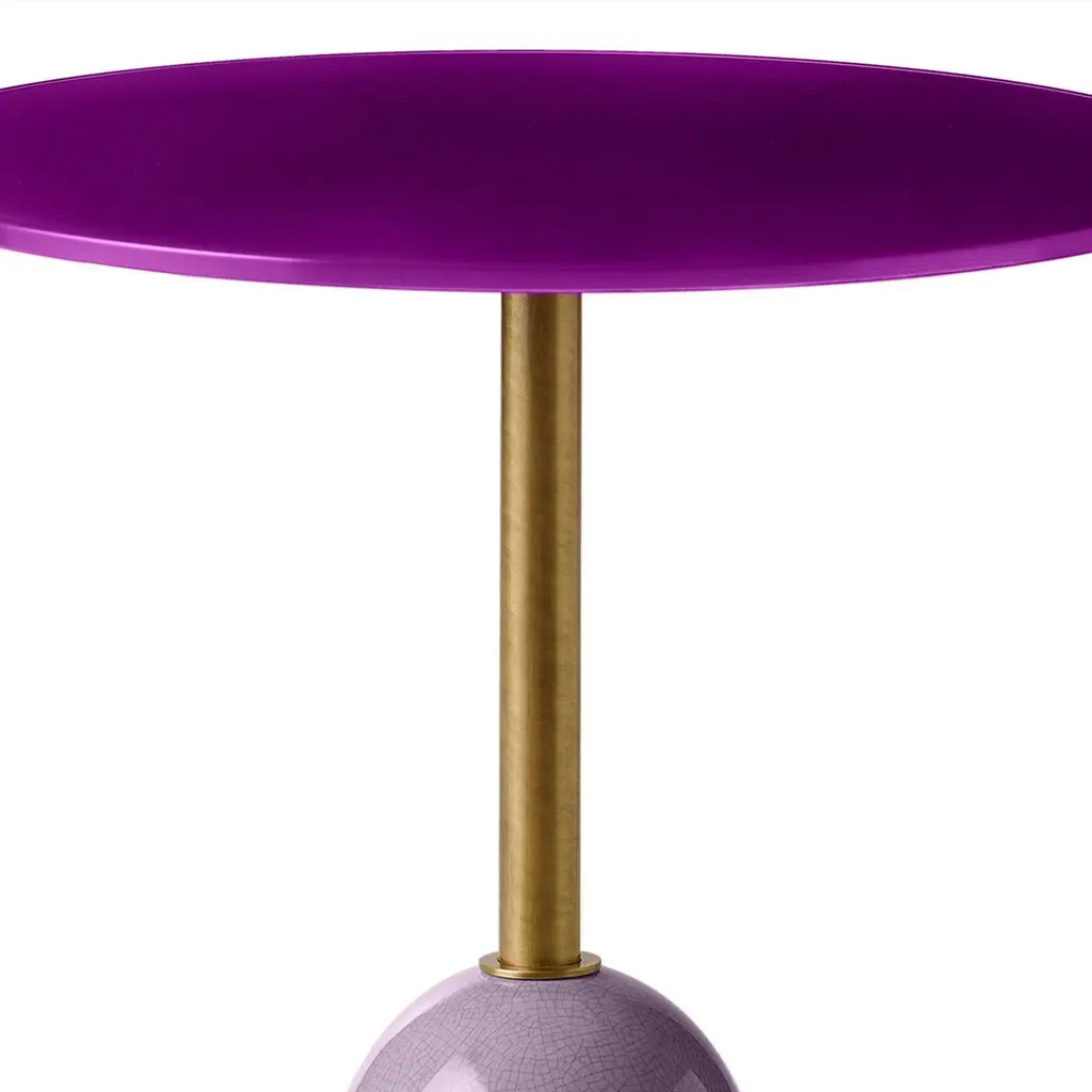 Pins round side table in brass with back painted glass top and ceramic glazed base in contrasting color. Available in different colors and finishes. The side tables of the Notorious collection have been designed with the intention of offering a refined and demanding clientele exclusive proposals that arise from the perfect mix of refinement of materials and deep knowledge of craftsmanship. Designer: La Récréation - P.Angelo Orecchioni Arch.