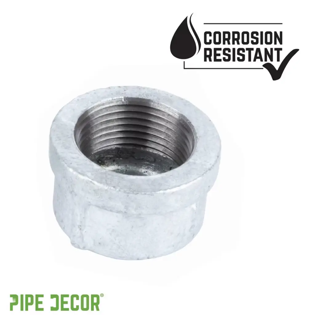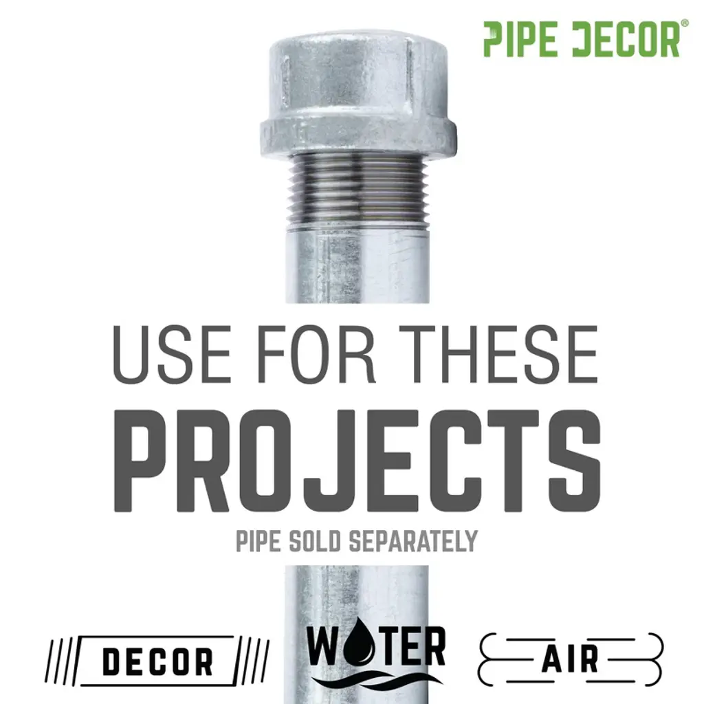 Cap it in style. Add a finished look to any pipe that’s not connected to another pipe or fitting. Use our galvanized caps as hook ends or feet for your side table. Create custom pipe fixtures and furnishings that will make a statement. Galvanized fittings are silver in color with a shiny finish that brings a clean, polished look to your pipe furniture. Our fittings are made with durable, industrial-grade malleable iron. Fittings are 100% authentic and are made to stand the test of time. You will know PIPE DECOR parts and accessories when you hold them. Beauty and beast. Strength and style. These are real industrial fittings for your decorations and designs. Accept no substitutes. Extra pieces and accessories are available for your custom projects and expansions. Plug and play as desired. Galvanized pipe fittings are corrosion-resistant and perfect for creating DIY furniture without worrying about rusting. They are project-ready with no cleaning or sealing required before use. Iron fittings complement a variety of looks and aesthetics, including steampunk lighting, industrial, factory, French country farmhouse, vintage, retro, reclamation, DIY customized, modern, and more. IPS threads offer compatibility with other project materials such as lamp parts and valves, and they are compatible with any pipes, fittings, and PIPE DECOR furniture kits of the same diameter.