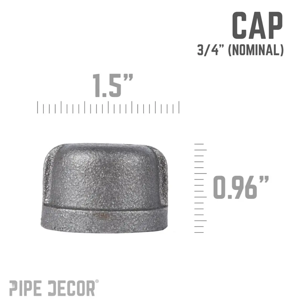 Cap it in style with PIPE DECOR fittings and add a finished look to any pipe that’s not connected to another piece. Use these caps as hook ends or feet for side tables, or to create custom pipe fixtures and furnishings that make a statement. Each fitting is crafted from durable, industrial-grade malleable iron, ensuring long-lasting strength and authenticity. You’ll recognize genuine PIPE DECOR parts the moment you hold them—beauty and beast, strength and style combined. These are real industrial fittings designed for your decorations and designs. Accept no substitutes. Extra pieces and accessories are available for custom projects and expansions, allowing you to plug and play as your creativity grows. Our iron fittings complement a wide range of aesthetics, including steampunk lighting, industrial, factory, French country farmhouse, vintage, retro, reclamation, DIY customized, modern, and more. Each cap features IPS threads for compatibility with other project materials such as lamp parts, valves, and additional PIPE DECOR components. We recommend cleaning and sealing each fitting before use. All pieces are fully compatible with any pipes, fittings, and PIPE DECOR furniture kits of the same diameter.