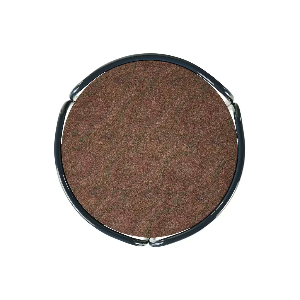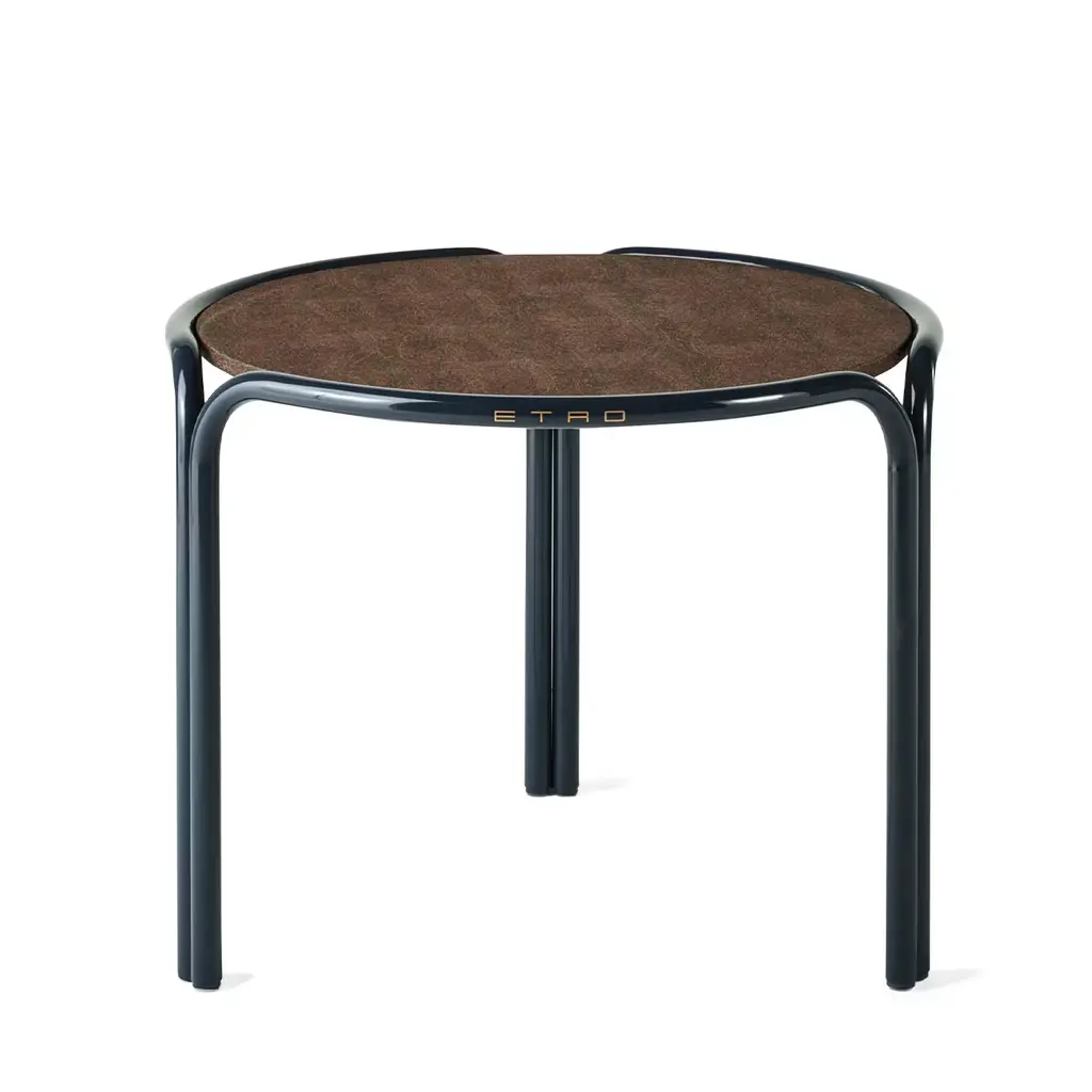 Recalling the iconic furnishings of the ‘70s, the Piping low table is characterized by a round shape enlivened by intense colours. Available in two dimensions, Piping showcases a polished, curved tubular structure, creating a playful combination of full and void parts. The top is covered with the signature Etro print Arnica, a coated fabric depicting the Tree of Life motif. Metal structure in night blue glossy lacquered finishing from the collection. Top in MDF covered in coated fabric Arnica.