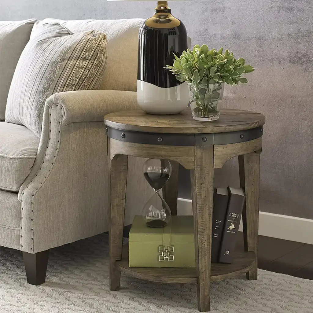 Elevate your living space with the Artisans Round End Table from the Plank Road Collection. Crafted from genuine New Zealand Pine, this solid wood piece exudes rustic charm and timeless appeal. Its round top provides ample surface area for lamps, books, or cherished mementos. The lower shelf adds extra display space, perfect for showcasing decorative items or storing magazines. With its weathered finish and natural wood grain, this end table tells a story of craftsmanship and authenticity. Versatile and functional, it seamlessly blends form and function, becoming a standout addition to any room in your home.