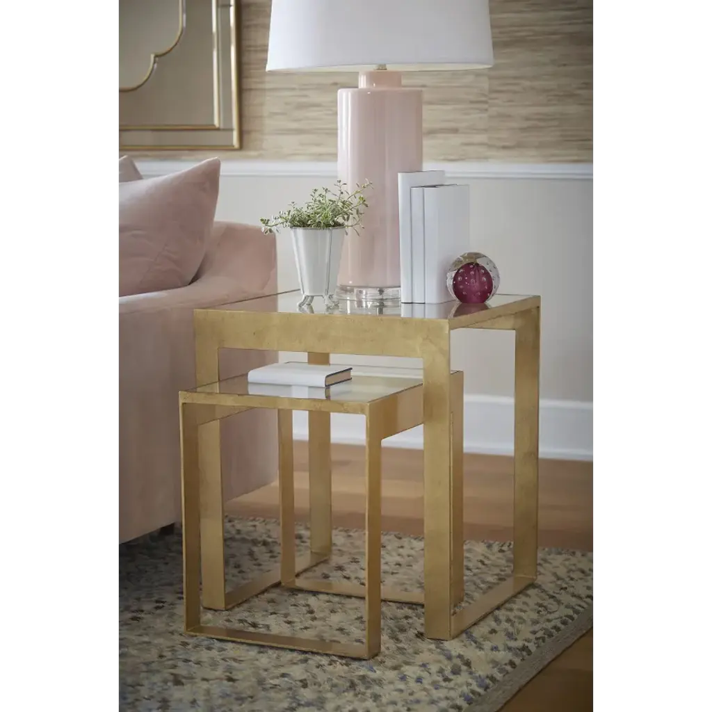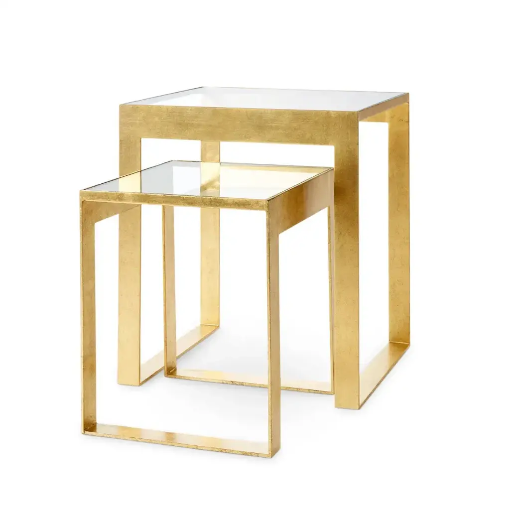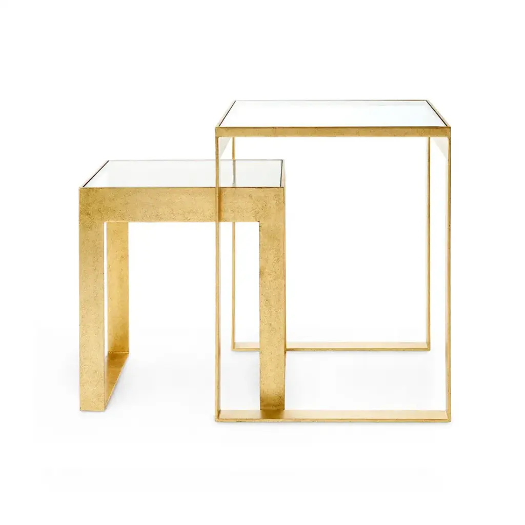 The two-piece Plano Side Table allows for endless experimentation. With a gilded, industrial glamour akin to 1920s Art Deco or the European Arts and Crafts movement, the Plano consists of bold planes and sleek geometries with a playfully creative edge. Each piece is rendered in iron, refined by gold leaf finishes, and topped with glass. The larger, cubic table is marked by thinner lines, which provide dynamic contrast to the smaller table’s thicker profile. When nested together, the pieces create an architectural, cagelike silhouette, though slight alterations in placement provide a range of impressions. Create a stepped surface area by pulling out the lower table, or separate them entirely and create a cohesive motif on either end of a sofa. For small spaces especially, the Plano is the perfect multi-use solution for when you need an extra drinks table.