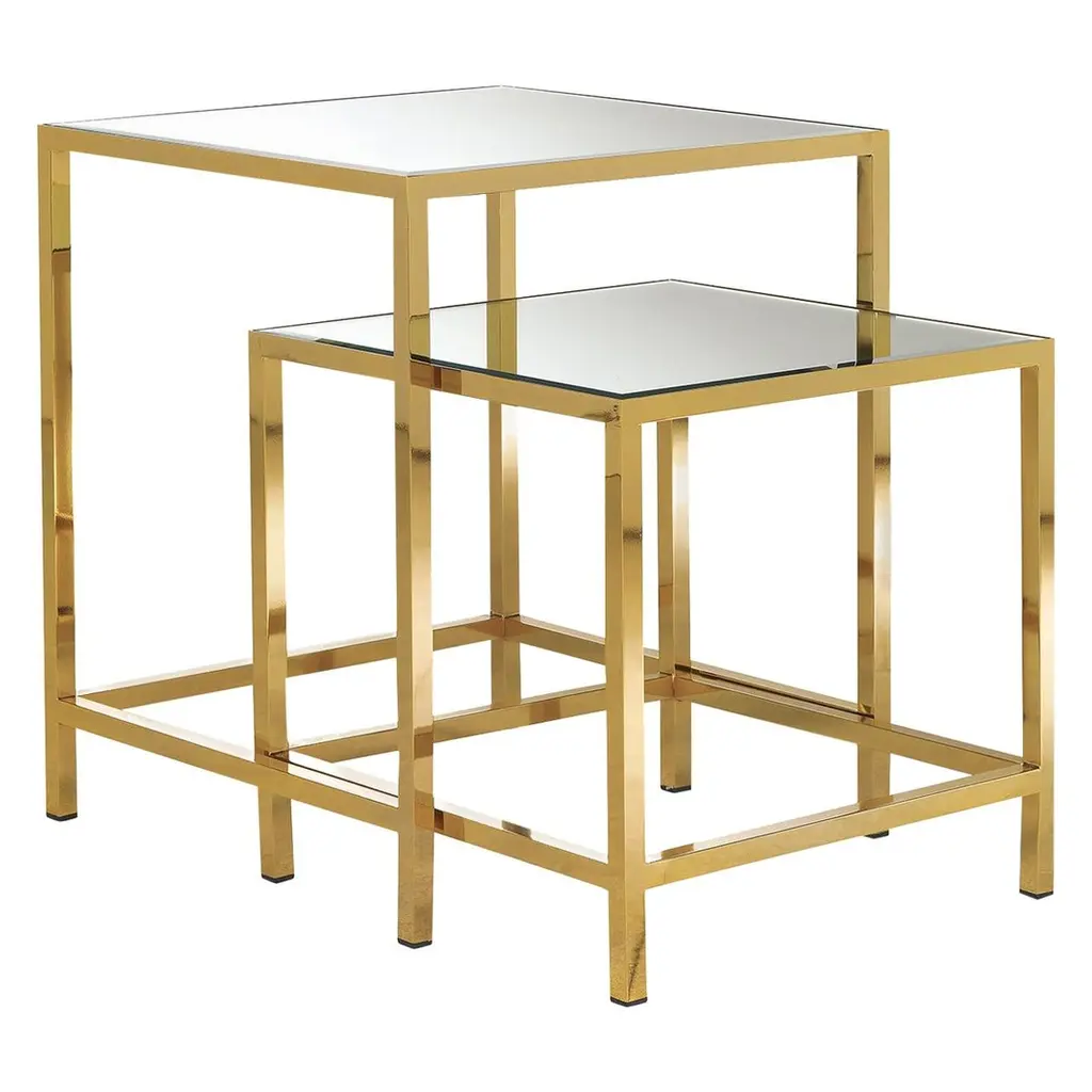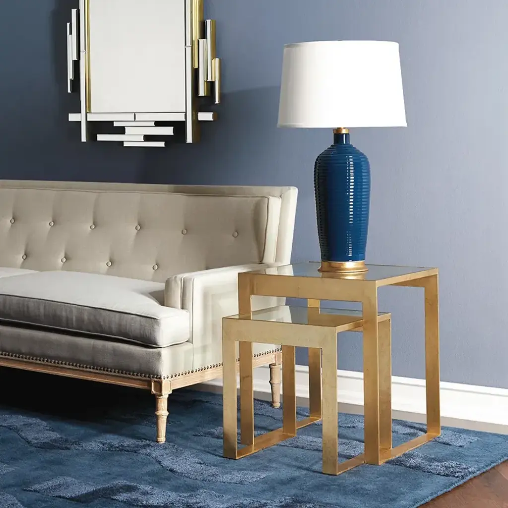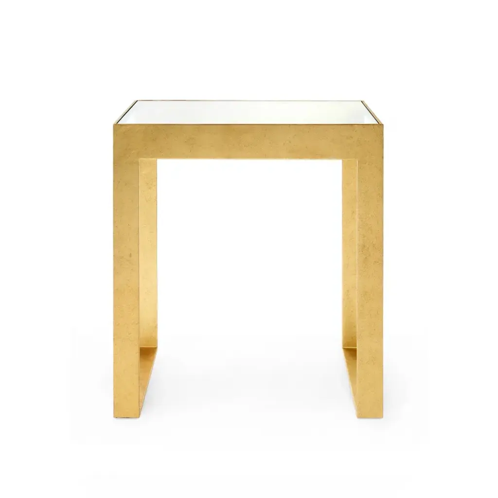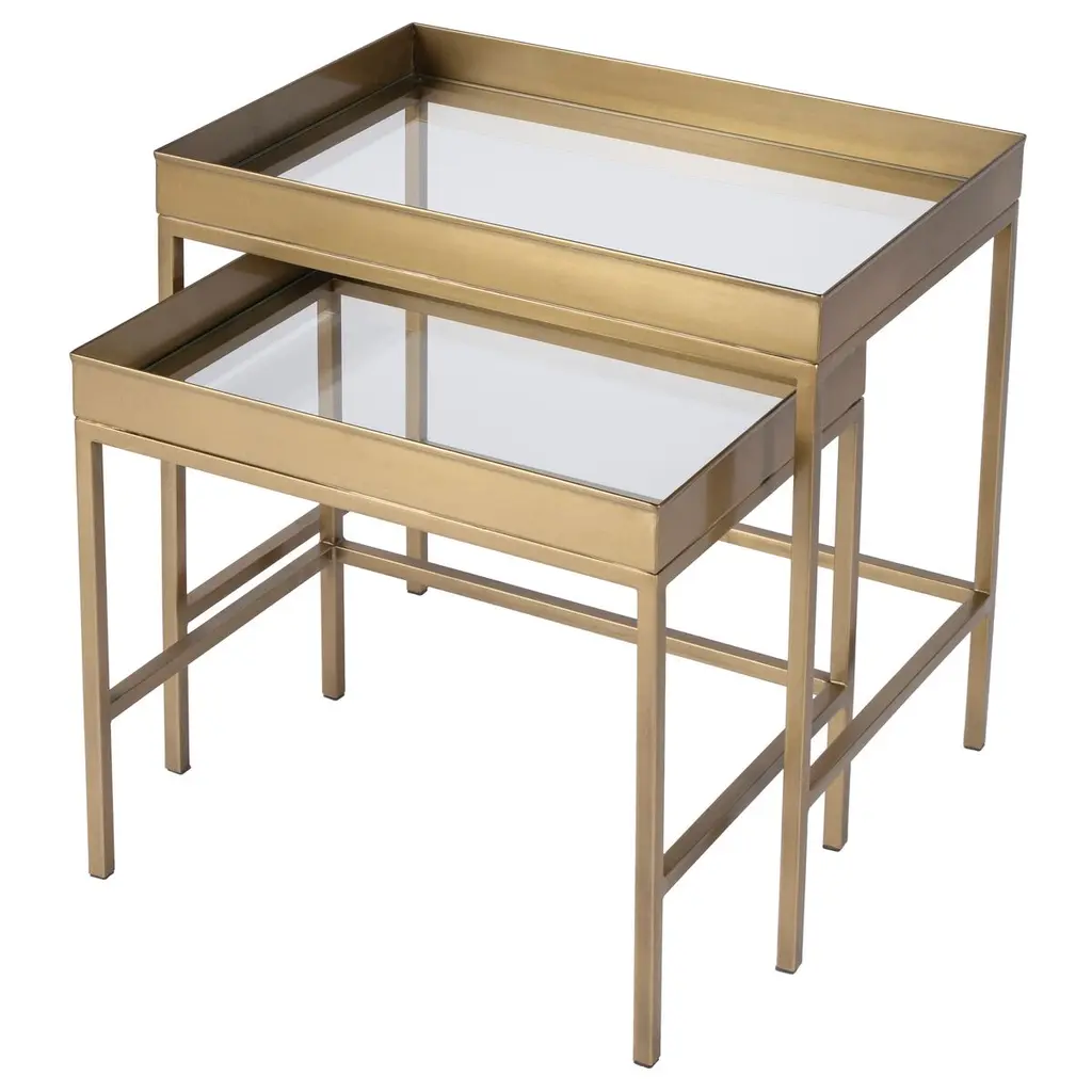 The two-piece Plano Side Table allows for endless experimentation. With a gilded, industrial glamour akin to 1920s Art Deco or the European Arts and Crafts movement, the Plano consists of bold planes and sleek geometries with a playfully creative edge. Each piece is rendered in iron, refined by gold leaf finishes, and topped with glass. The larger, cubic table is marked by thinner lines, which provide dynamic contrast to the smaller table’s thicker profile. When nested together, the pieces create an architectural, cagelike silhouette, though slight alterations in placement provide a range of impressions. Create a stepped surface area by pulling out the lower table, or separate them entirely and create a cohesive motif on either end of a sofa. For small spaces especially, the Plano is the perfect multi-use solution for when you need an extra drinks table.