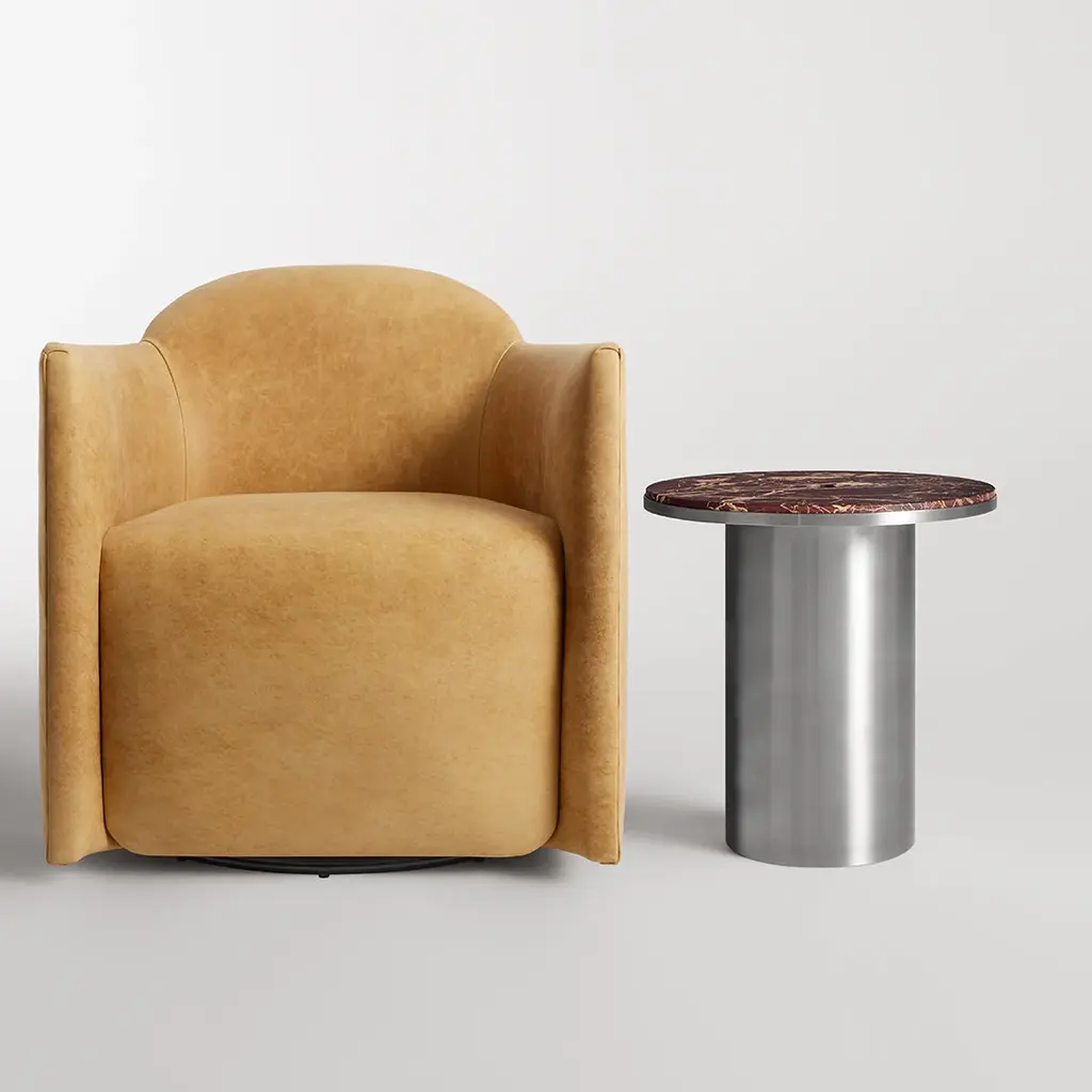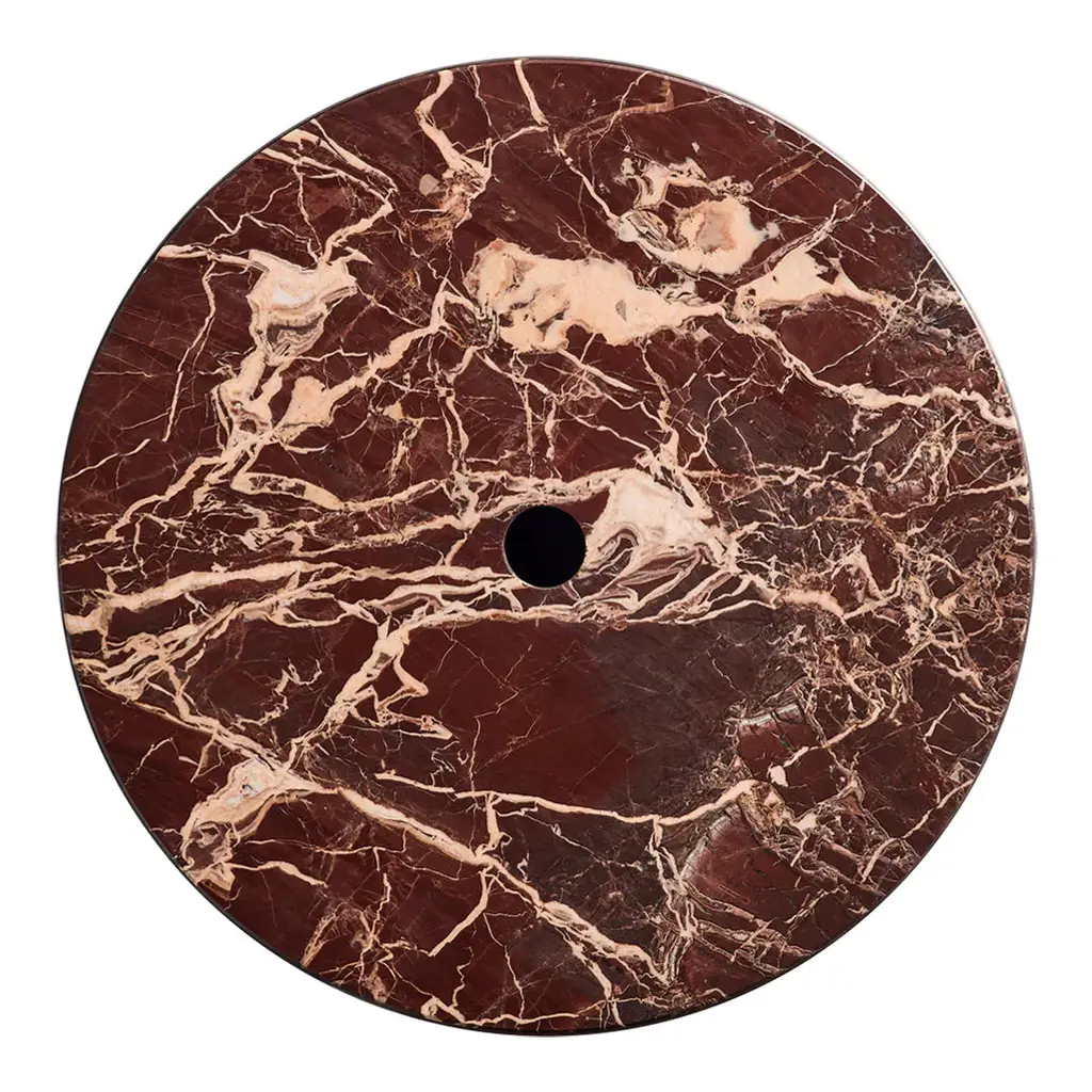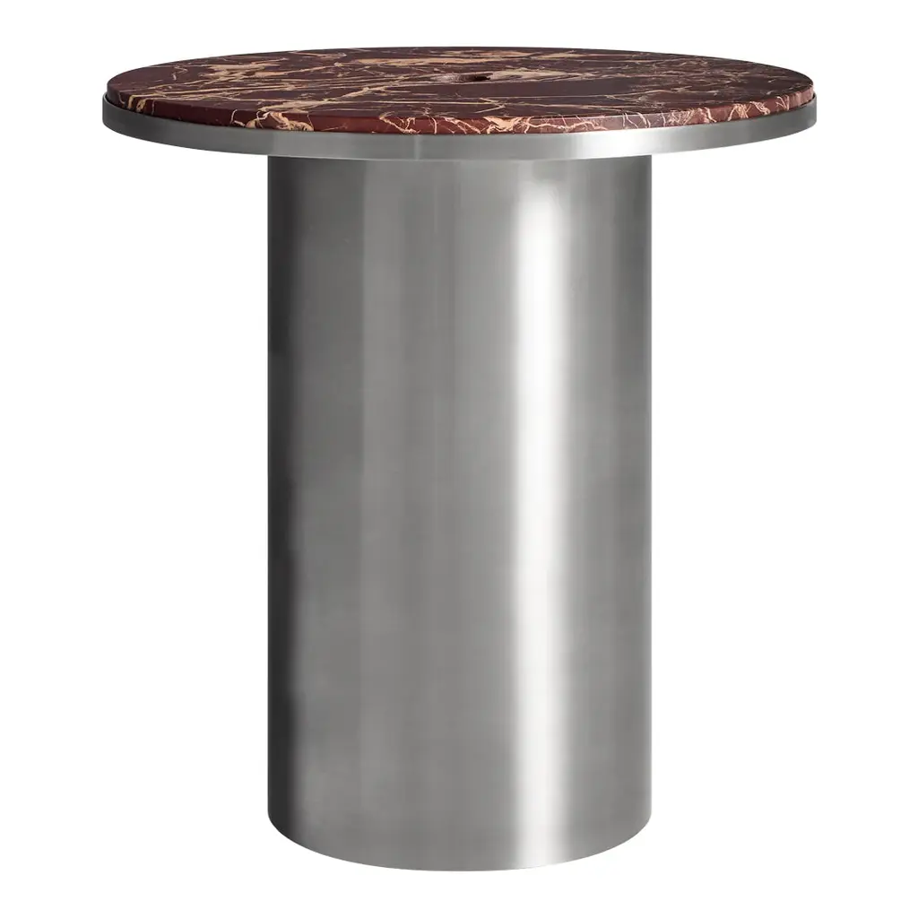 A polished wheel of Carrara marble sits on a tidy steel base for an effect that is loaded with low key elegance.