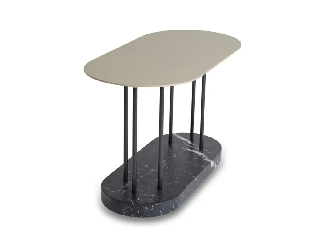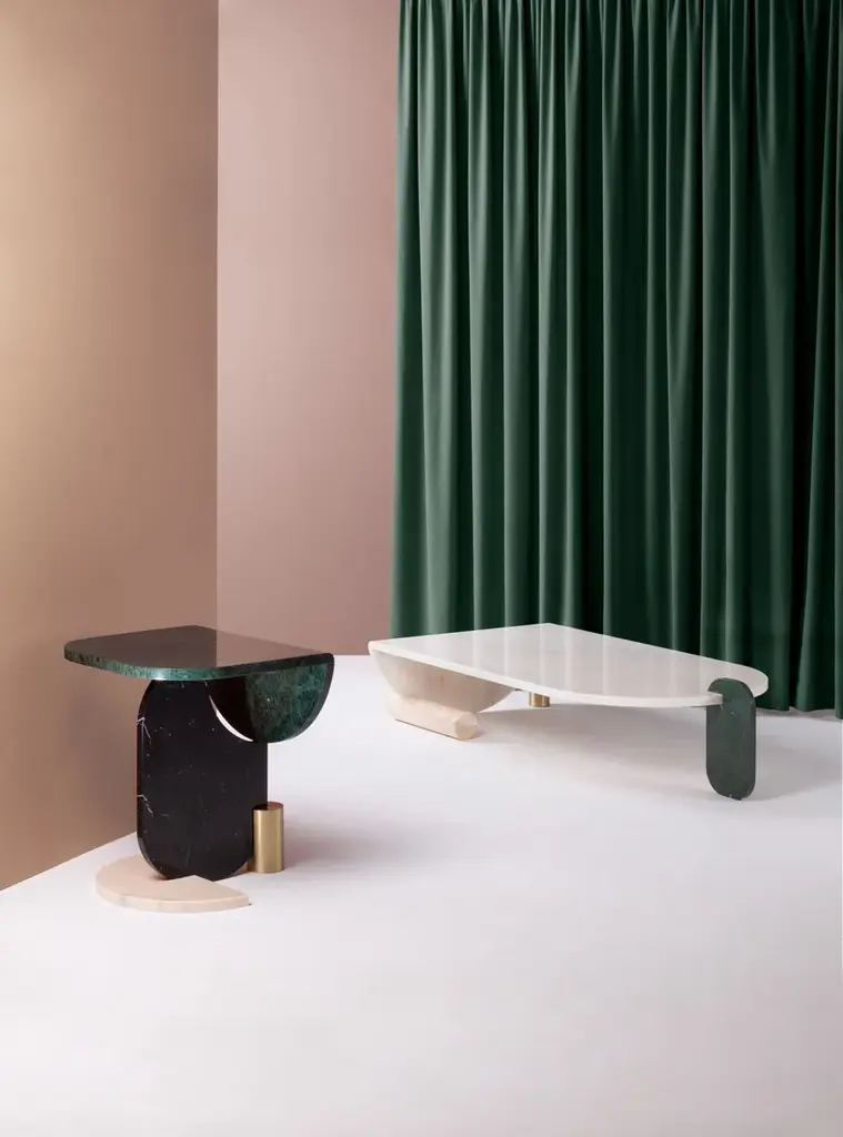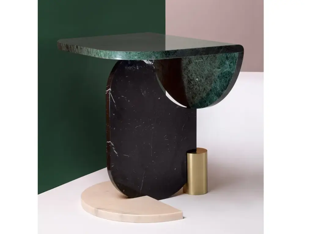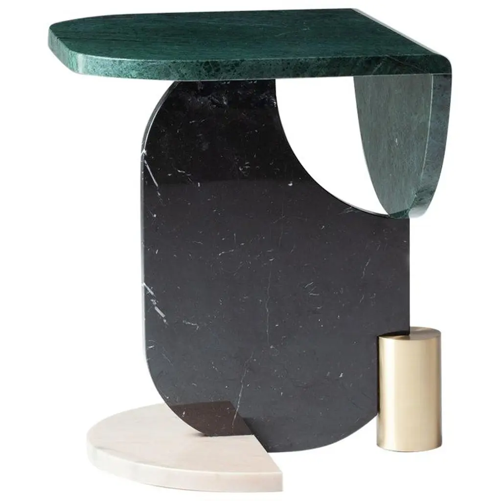 Top: Marble: Nero Marquina, Guatemala Green, Estremoz White,Estremoz Rose, Emperador and CarraraOval base: Marble: Nero Marquina, Guatemala Green, Estremoz White,Estremoz Rose, Emperador and CarraraHalf-circle base: Marble: Nero Marquina, Guatemala Green, Estremoz White,Estremoz Rose, Emperador and CarraraMetal base: Polished or Satin: Brass, Copper or NickelThe essential shapes of these tables play between them in an alluring game of proportion and color which results in the creation of a perfect balance and tension of material and negative space. The absence of figurative shapes allows you to look at this piece from different angles and imagine various things.
