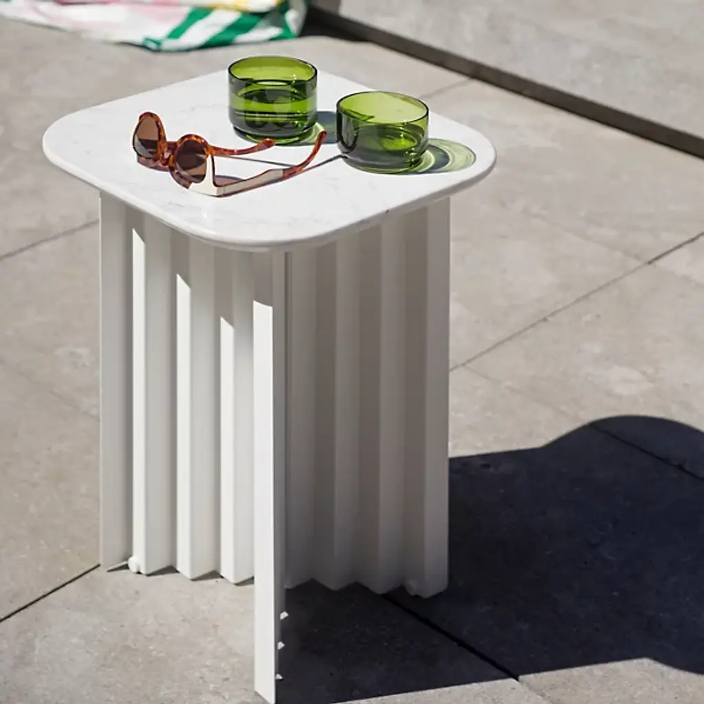 Side tables don’t always have to be pushed aside. The Plec Small Side Table by RS Barcelona adds a fun and modern decorative statement while complementing a living room or bedroom décor. Tall pleated legs taper inward to create a dimensional structure that interplays elegantly with light and shadow. A rounded square top softens the geometric design, while its sturdy cataphoretic-coated steel construction makes it ideal for use indoors or out.