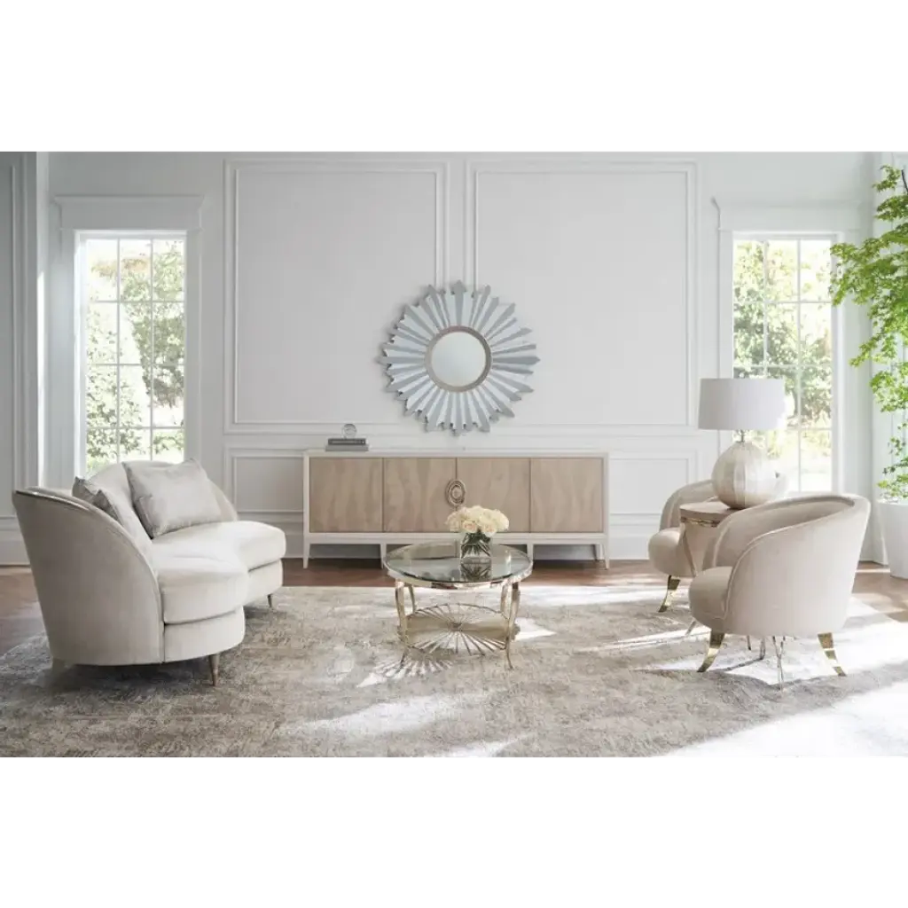 Poised to make a dramatic impression, the Plié accent table draws the eye with an Art Nouveau-inspired, fanfold metal stretcher that doubles as a small shelf. A warm Chinchilla finish illuminates a radiating wood grain on top, intricately crafted from grey curly maple veneers. Square saber legs lend contemporary flair to its ornate frame in a Whisper of Gold.