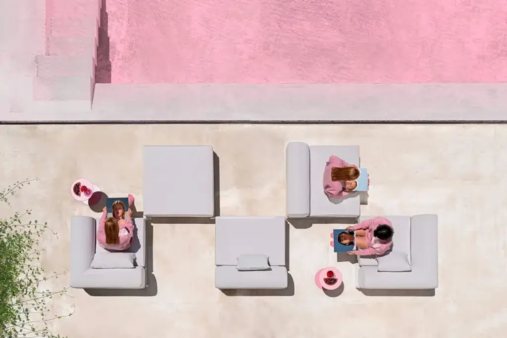 Ploid is a collection made up of three modular elements, which can be configured in multiple different ways for seating, as well as organising spaces. And it turns out that there is practically nothing that can’t be done with the three Ploid pieces: from a simple armchair to a divan, a love seat or an endless sofa with a chaise longue, a flat surface for using as a lounger or an oversize chair like a chill out bed. It can also be easily reconfigured depending on the occasion.These three pieces include a modular corner element, an individual chair with backrest and a multipurpose element resembling a pouffe. The corner element is mirrored, it can just as easily be used as a left corner element as for a right corner. If two are combined together they create a small sofa or love seat. If an individual element with backrest is added in-between it can be extended to create a multi-seater sofa as required. These individual modules can also be arranged as a more casual sofa without using corner elements at the ends.All of these configurations are typical of a modular system, what makes Ploid unique is the addition of the pouffe module. Allowing for more flexible and numerous arrangements to be created. On the one hand it allows for the individual seats to convert into a divan or chaise longue while on the other hand because it is totally flat the arrangement can also be used as an elongated stool, a daybed or a lounger, if two or more are joined together, and even if extended when configured as a love seat it becomes a chill out bed.Designed by the Romero Vallejo studio the Ploid collection is a modular tour de force based on a minimalist approach. With its three elements configuring different layouts over the course of a day depending on the changing needs of the time of day could not be easier. The continuous leg that supports the pieces, almost like a skate, can be joined to lock them in place if required. The oversized backrests and cushions can also be fixed in place using zips. The filling consists of a polyurethane foam suitable for use outdoors. A small round side table can be added to complete the set that can also be used in-between the modular units as if floating over the seats.Made of textured thermo-lacquered aluminium structure.Phenolic plate.Structure and phenolic colours: White, pink, red, grey, anthracite, sand, bronze.