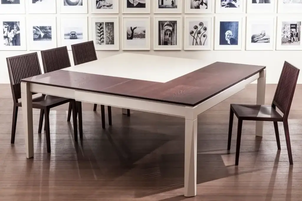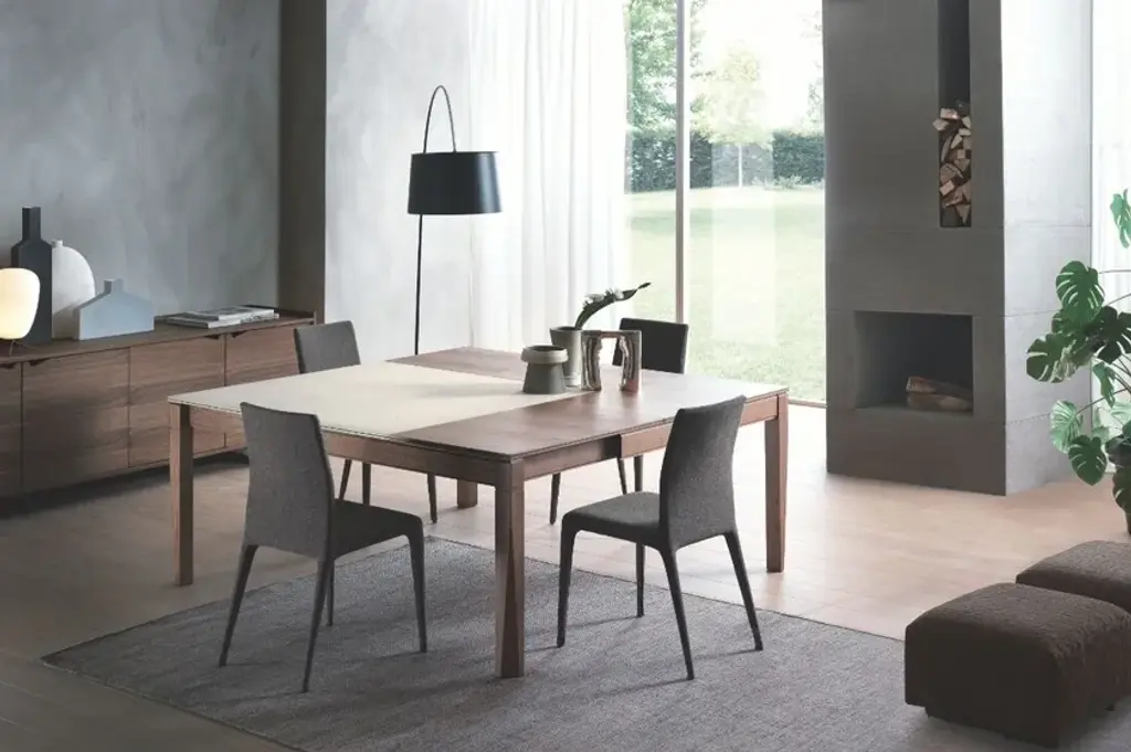 PLURIMO is a square dining table extendable on both sides with leaves stored inside.Frame made of solid ash wood. Top available in ash wood veneer or Cimento (eco-concrete).Internal leaves are veneered. Opening mechanism made of aluminum.
