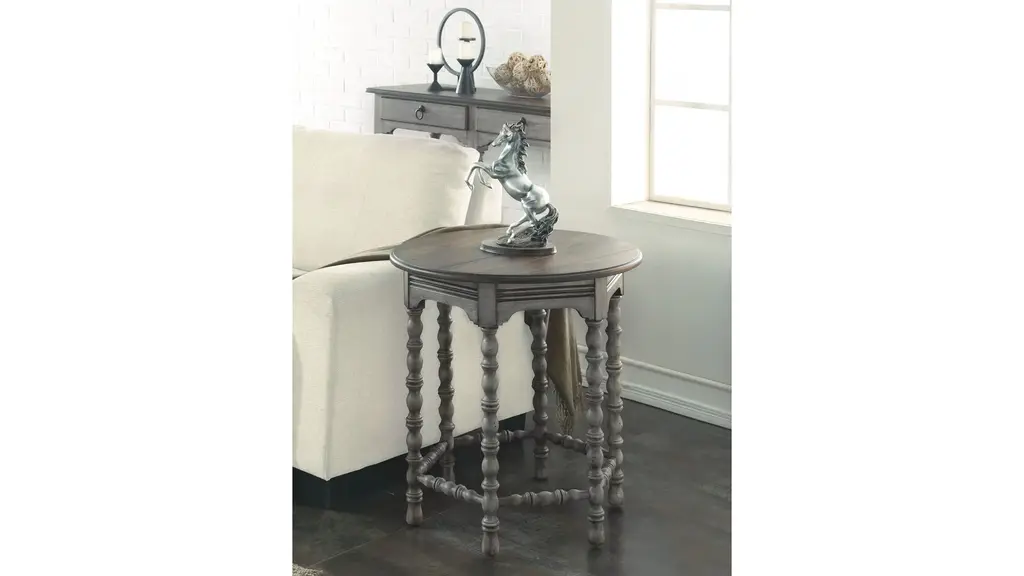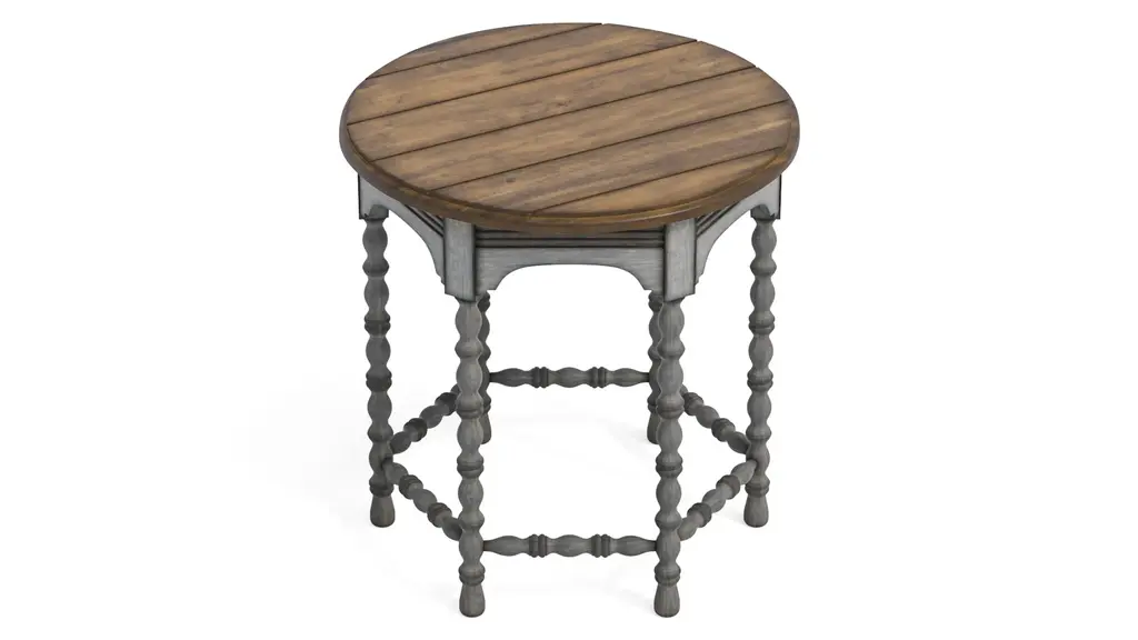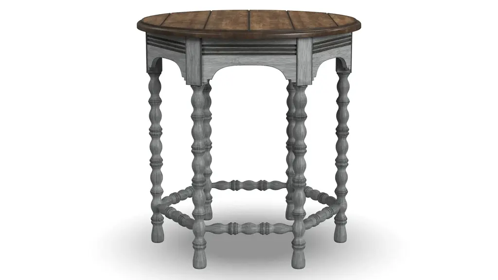 Bring the inviting look of vintage charm to your living spaces with the Plymouth Lamp Table. Featuring intricately spool-turned legs and trestles, carved accents and a distressed graywash finish with contrasting medium brown top, this table is sure to add warmth and character to your living space.