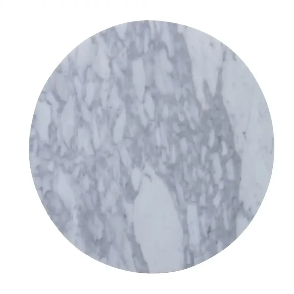 This petite accent table features a Carrera marble top raised on a brass pod shaped base.