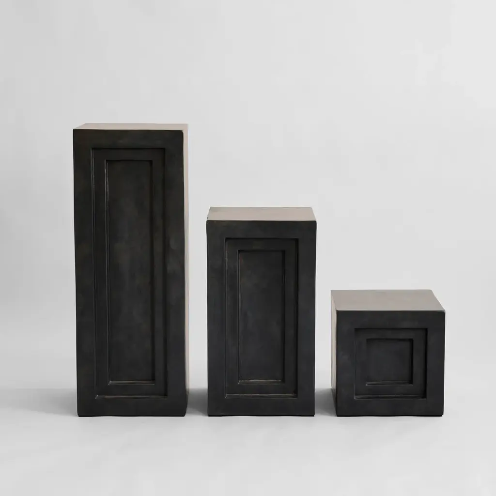 Podium is a means to get the gallery feeling and exhibit your favourite object or piece of art at home. Inspired by architectural façade details, each podium has a carved relief on two opposing sides, creating a beautiful play of shadows changing throughout the day, depending on the direction of light. The podium can be placed both horizontally and vertically, facing a wall or standing freely in a room as it has no backside. Available in three different heights, the podium is just as suitable for use as a side or coffee table. Designed by Kristian Sofus Hansen & Tommy Hyldahl.