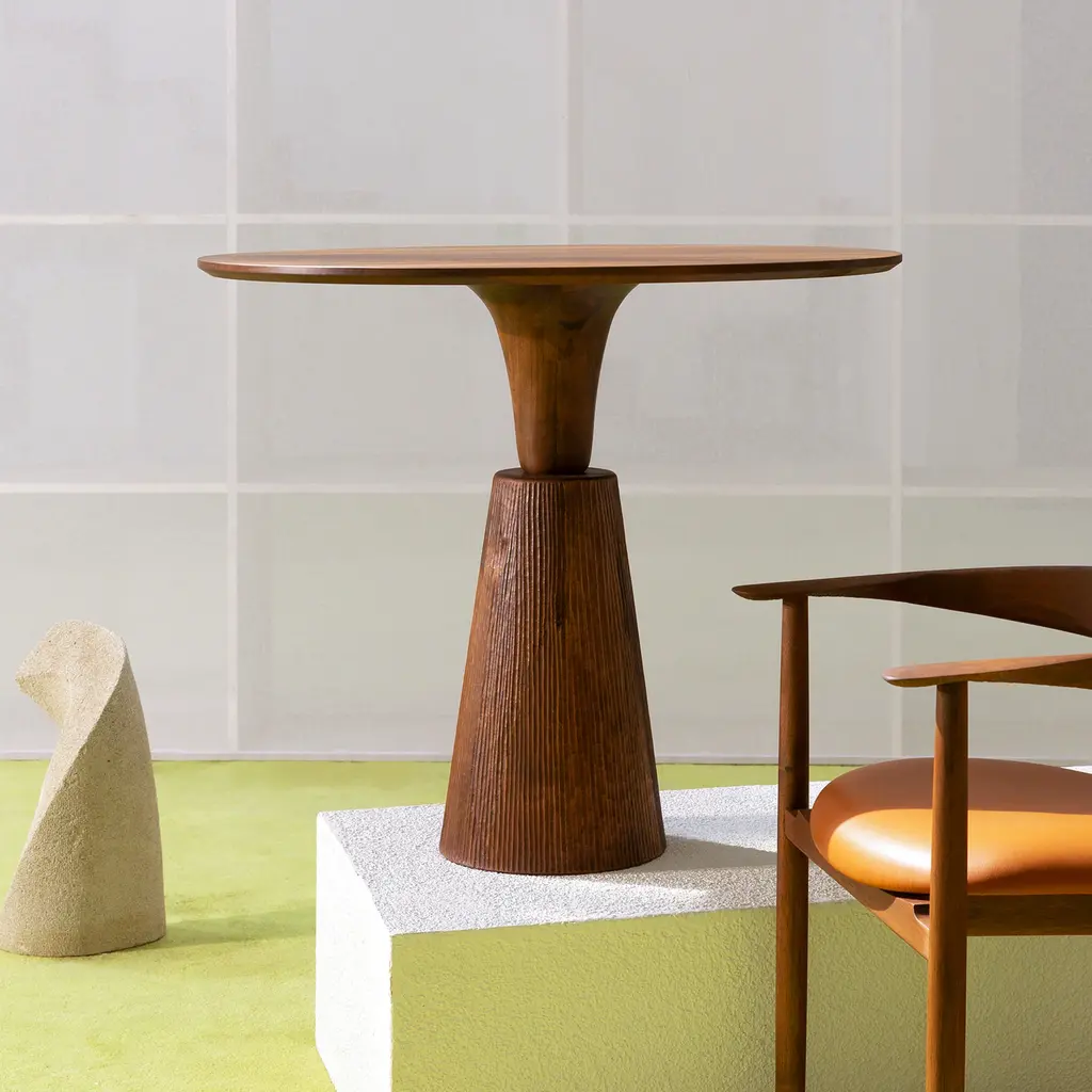 Like a ballet dancer lifted en pointe, this table from Zanat is gracefully poised and perfectly balanced. Its hand-carved base features natural tree bark patterns, and comes in a variety of sustainably forested woods, which contrasts elegantly against a bell-curved neck and smooth surface. Pointe is ideally sized for service as a bistro dining or a generous side table, and tabletops are available in solid wood or ceramic. Variations in color and small knots in the wood are advantages of the design, and should be considered indications of material authenticity.