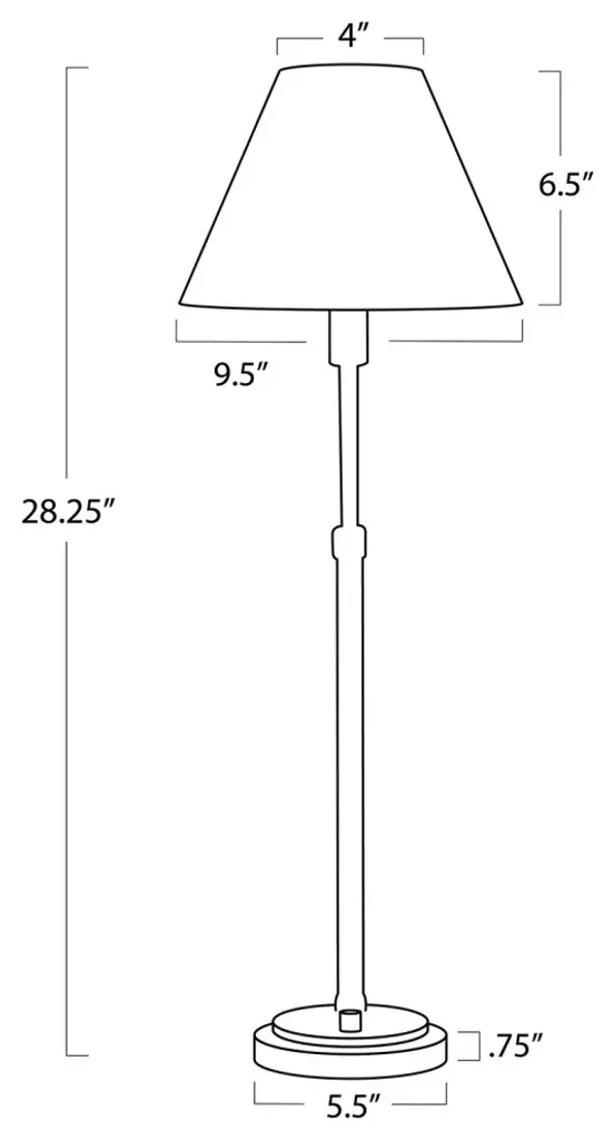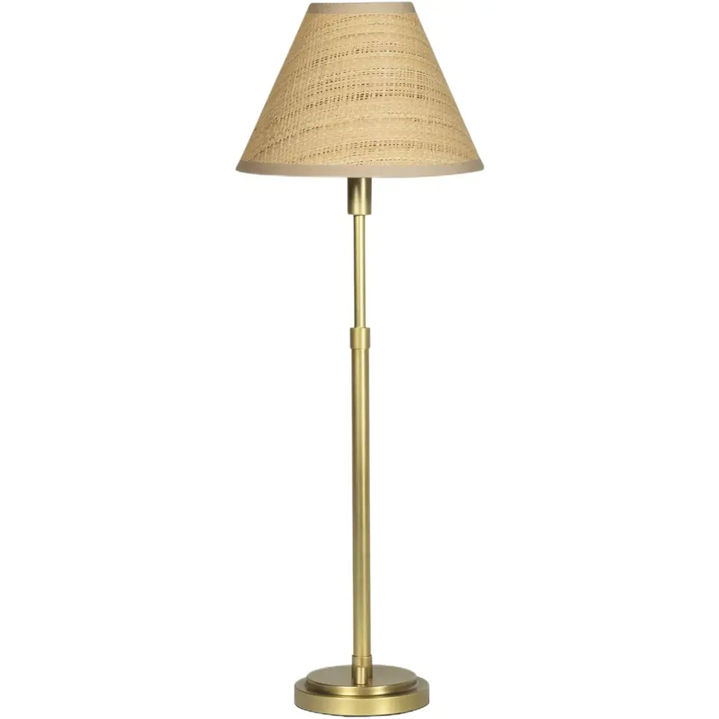 The Polly Buffet Table Lamp exudes timeless elegance with its woven rattan shade, delicately edged with natural trim. This shade casts a soft, comforting glow, enhancing the ambiance of your dining or side table. The lamp''s sophisticated design is complemented by its graceful base, which combines classic charm with a touch of contemporary flair. Perfect for adding a refined and versatile touch to any room, the Polly Buffet Table Lamp elevates your space with its unique and stylish presence. Regina Andrew Polly Buffet Lamp (Blackened Brass with Rattan Shade); Dimensions 9.5W x 28.25H x 9.5D; Uses 1 maximum 60 Watt E12 Base Bulb (Not Included); Dry; Standard; ETL/CETL
