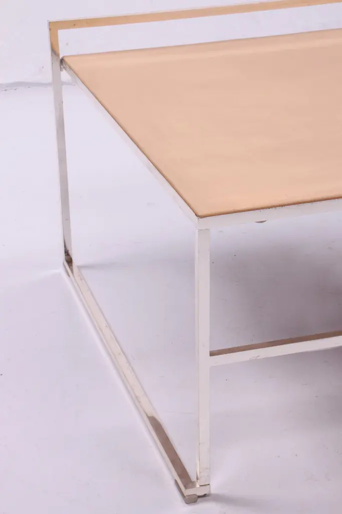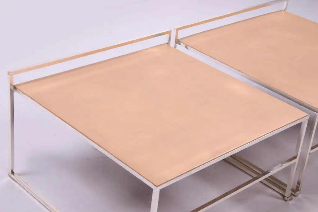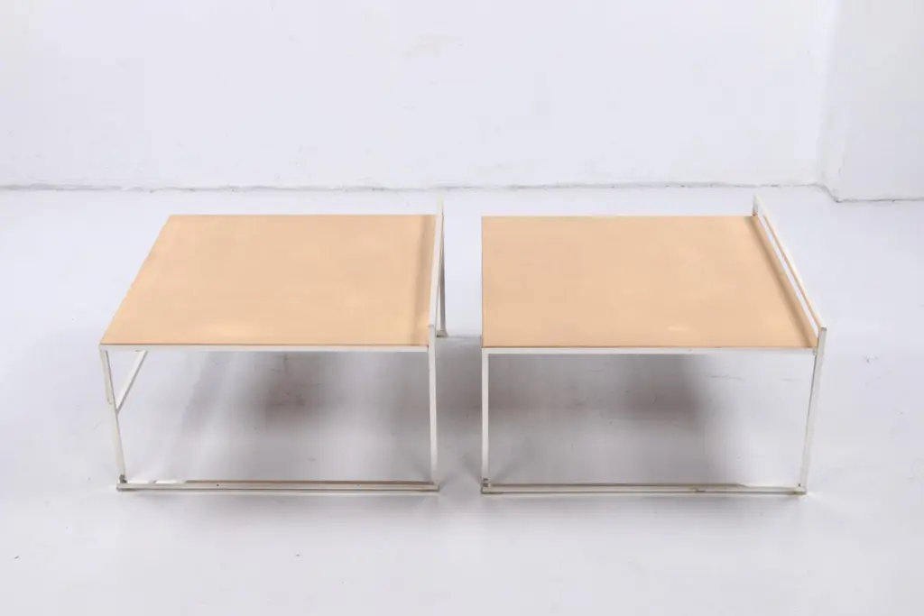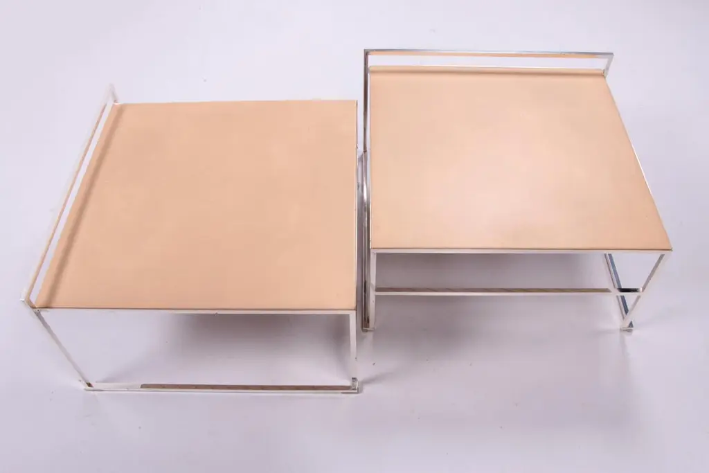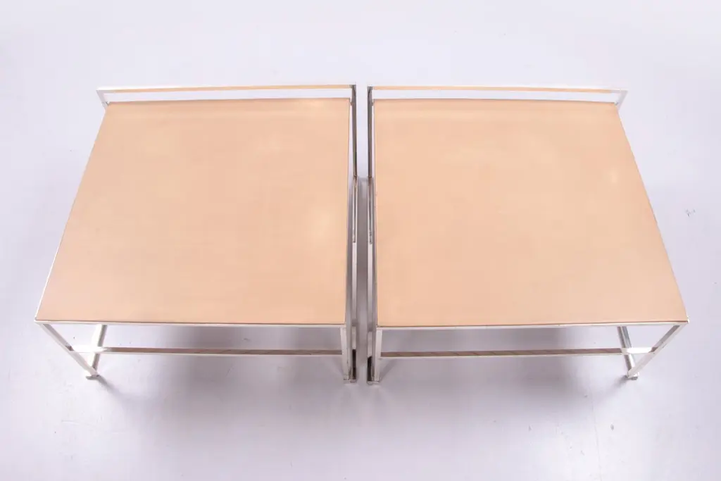 Poltrona Frau set of 2 side tables with leather top 1970, ItalyFrom the home of Poltrona Frau in Northern Italy comes this timeless Statement Piece in excellent vintage and original condition. We have 2 sets of two beautiful stylish side tables.The frame is made of chrome, there are some signs of wear here and there, which is not surprising given the age. The top is made of cream colored leather.Sustainable: environmentally conscious By supplementing your interior with vintage furniture, you are environmentally conscious. This is because no new raw materials need to be used for this product.When you choose vintage, you use what is already there and that makes it sustainable. You may not give the furniture a second, but even a third or fourth life. Vintage furniture is often high-quality products that last a number of lives for a reason.Vintage has a story There is a story behind every vintage product. Some furniture has a rich history and for some the story is still visible or tangible. The traces of use give a glimpse into the life of the previous owner.
