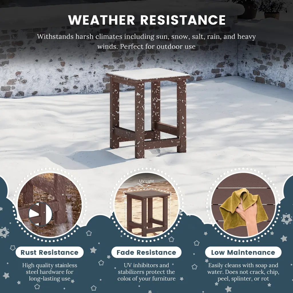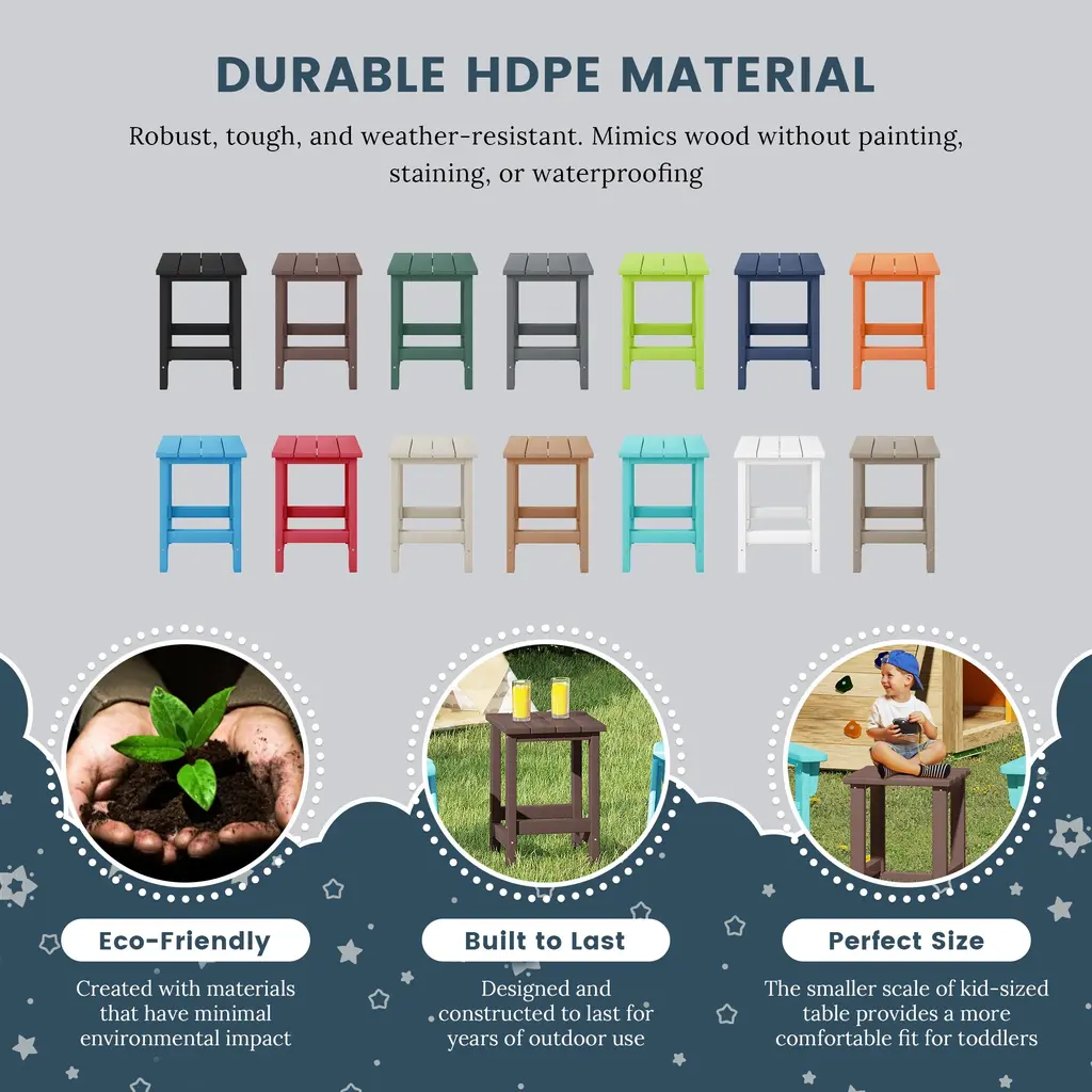 Let your little ones enjoy outdoor fun in style with our kid-friendly HDPE side table. Crafted from durable, weather-resistant, UV, and Fade-Resistant HDPE, this table is designed to withstand the elements and provide endless fun outside. Its compact size and sturdy construction make it perfect for your little ones room. Stable design with the thick legs and beam connection between the legs ensure a stable design. Simple to clean all of your little ones artistic drawings with just simple lukewarm water, mild soap, and a soft bristle brush or with a pressure washer that can get rid of all that manual labor and make cleaning easier without worrying of damaging the durable material.While we strive to accurately represent product colors, please be aware that actual colors may vary slightly due to individual screen settings and lighting conditions. FeaturesDetails:Side Table