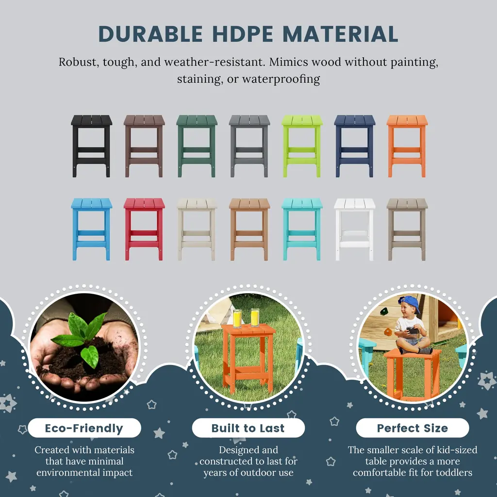 Let your little ones enjoy outdoor fun in style with our kid-friendly HDPE side table. Crafted from durable, weather-resistant, UV, and Fade-Resistant HDPE, this table is designed to withstand the elements and provide endless fun outside. Its compact size and sturdy construction make it perfect for your little ones room. Stable design with the thick legs and beam connection between the legs ensure a stable design. Simple to clean all of your little ones artistic drawings with just simple lukewarm water, mild soap, and a soft bristle brush or with a pressure washer that can get rid of all that manual labor and make cleaning easier without worrying of damaging the durable material.While we strive to accurately represent product colors, please be aware that actual colors may vary slightly due to individual screen settings and lighting conditions. FeaturesDetails:Side Table
