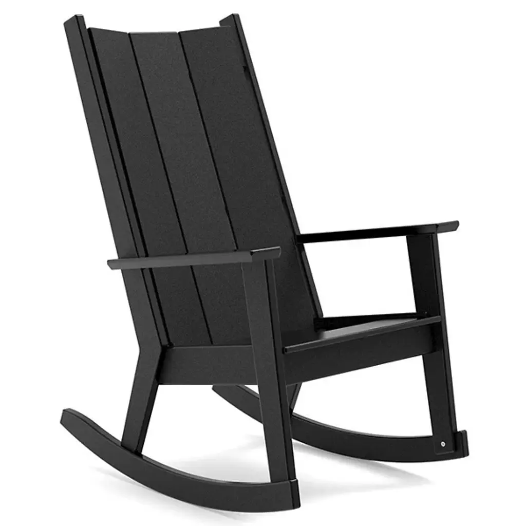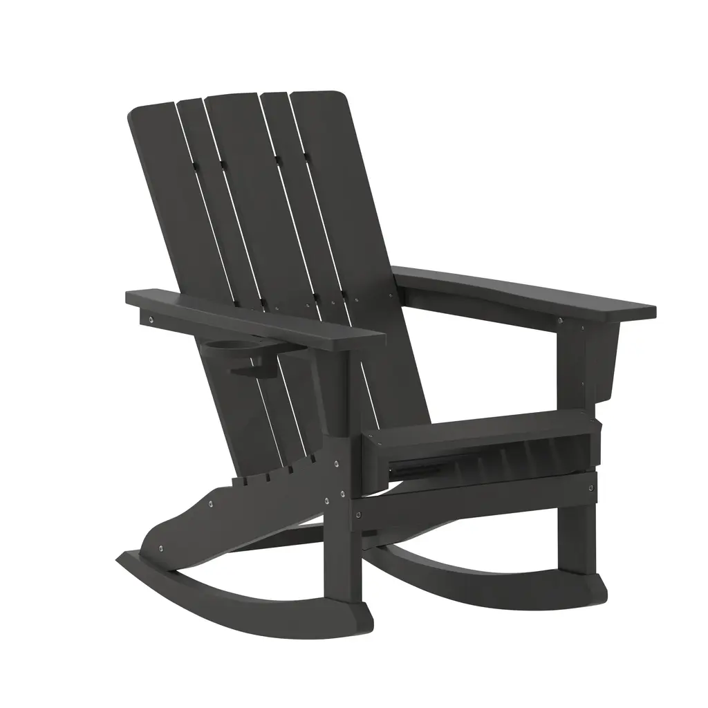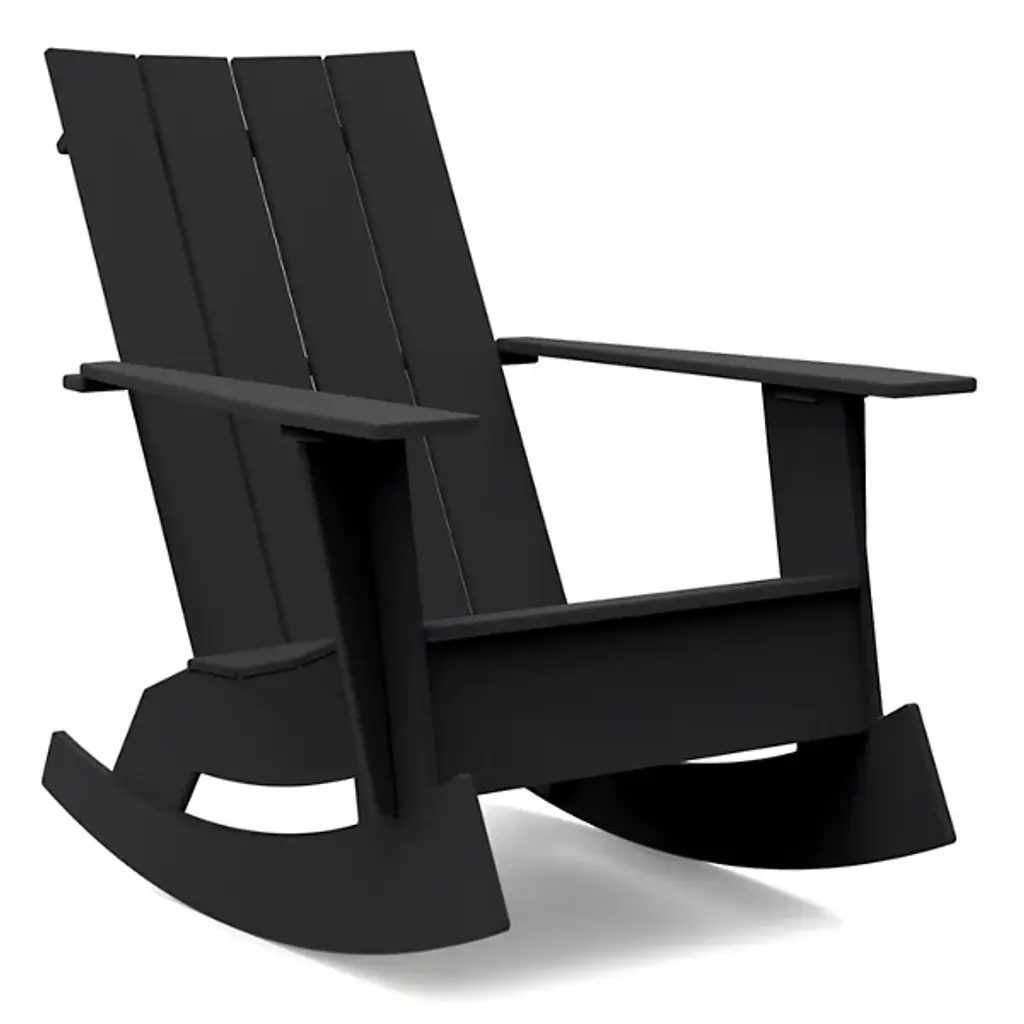 The modern adirondack rocker combines the relaxed comfort of an adirondack chair with the smooth undulation of a rocking chair. It looks great in a pair with a polywood side table or grouped with other outdoor rockers around a conversation table.