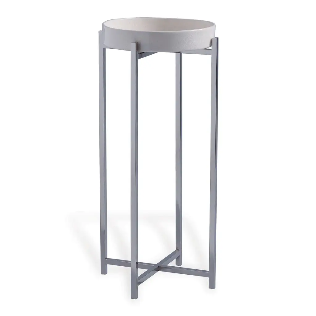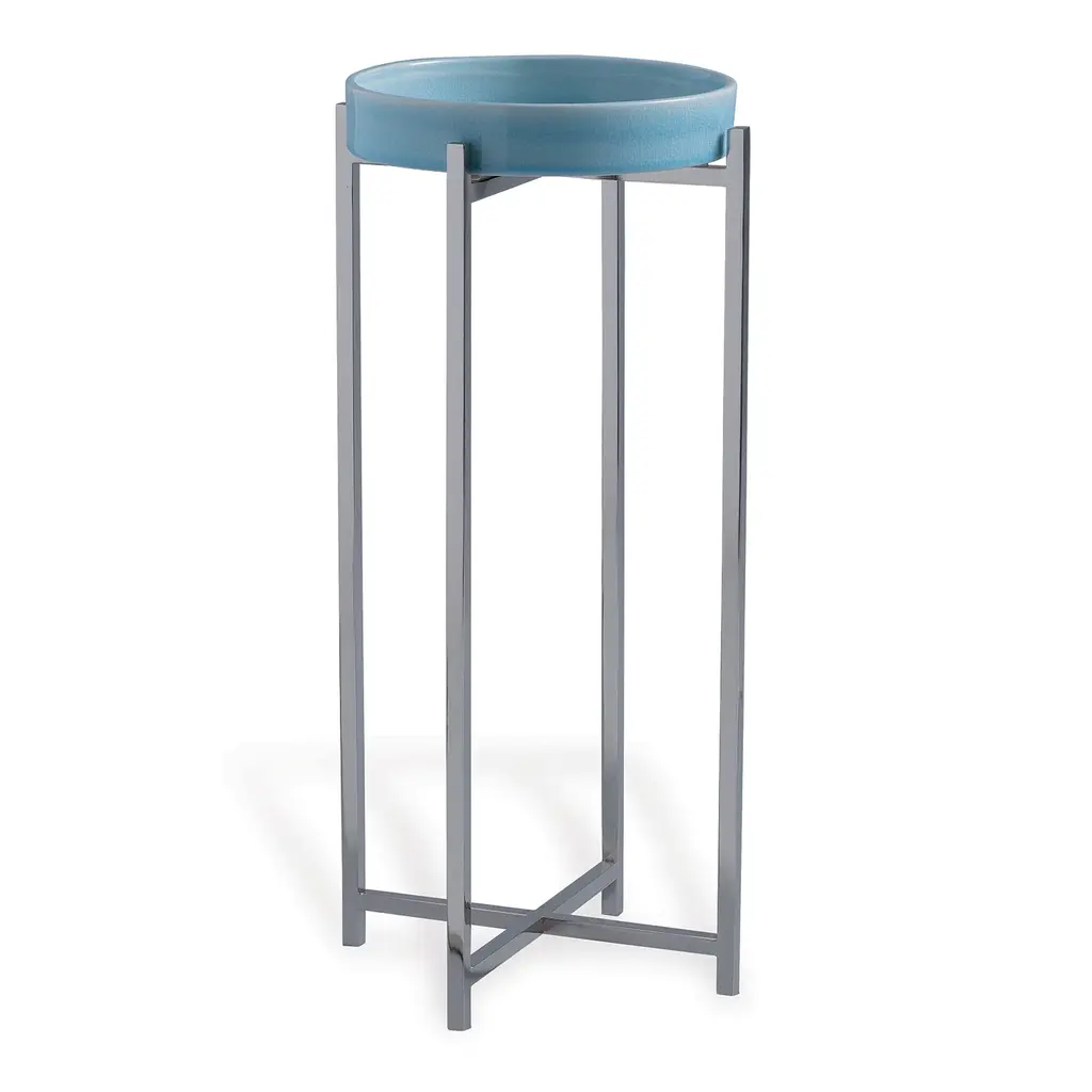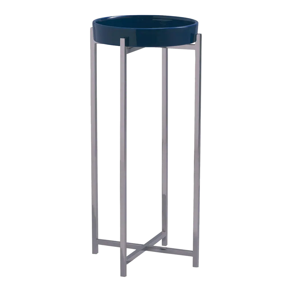 The Jody accent table by Port 68 is a bright and colorful cleaned lined accent table which features a porcelain tray top in a navy blue glaze. Accented with nickel polished solid steel base. Also available in creme and sky blue. Porcelain tray top measures: 9.5" diameter. Overall Measurements: 23"H x 11" Diameter Materials: Steel, porcelain Ships via UPS Free shipping in the U.S.