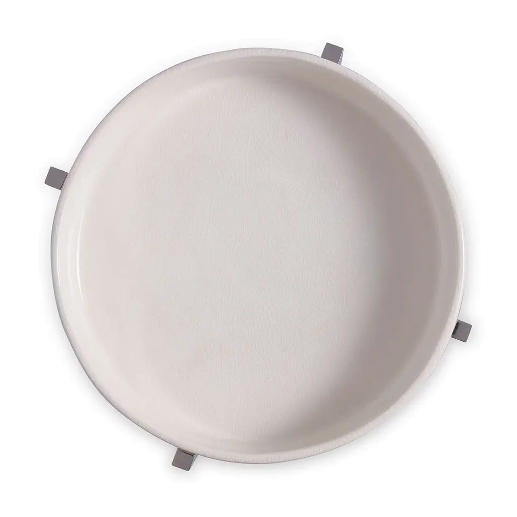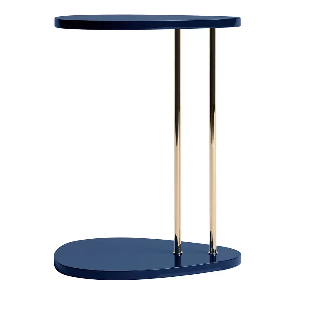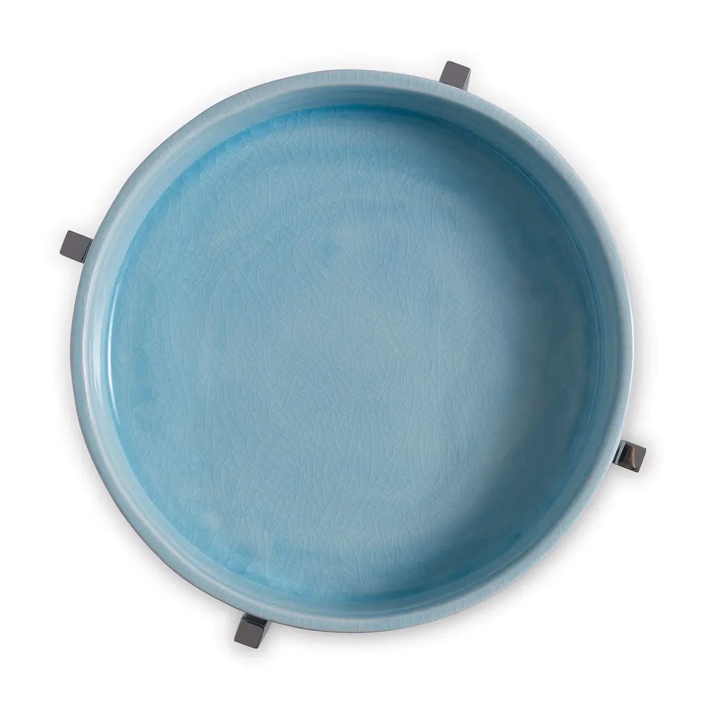 The Jody accent table by Port 68 is a bright and colorful cleaned lined accent table which features a porcelain tray top in a navy blue glaze. Accented with nickel polished solid steel base. Also available in creme and sky blue. Porcelain tray top measures: 9.5" diameter. Overall Measurements: 23"H x 11" Diameter Materials: Steel, porcelain Ships via UPS Free shipping in the U.S.