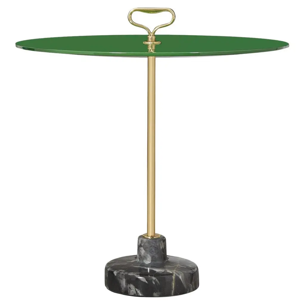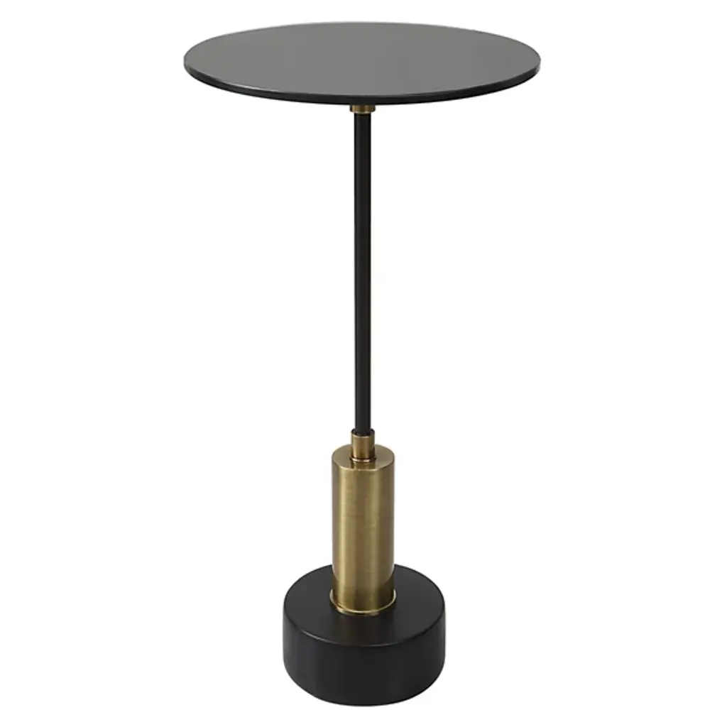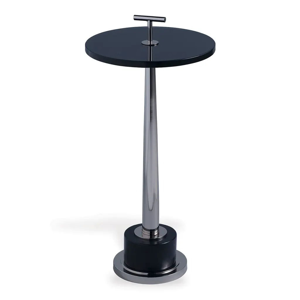 Toronto is our modern tapered turned accent table. Available in polished nickel, and aged brass, the tables are accented with a black tempered glass top and granite base. We love the T shaped center pull which makes it so easy to move the table where the action is. Scaled at 12" diameter, the table is perfect for a coffee or your favorite adult beverage. Size: 25.5"H x 12" Diameter Materials: steel, granite Also available in nickel. Free shipping in the U.S.
