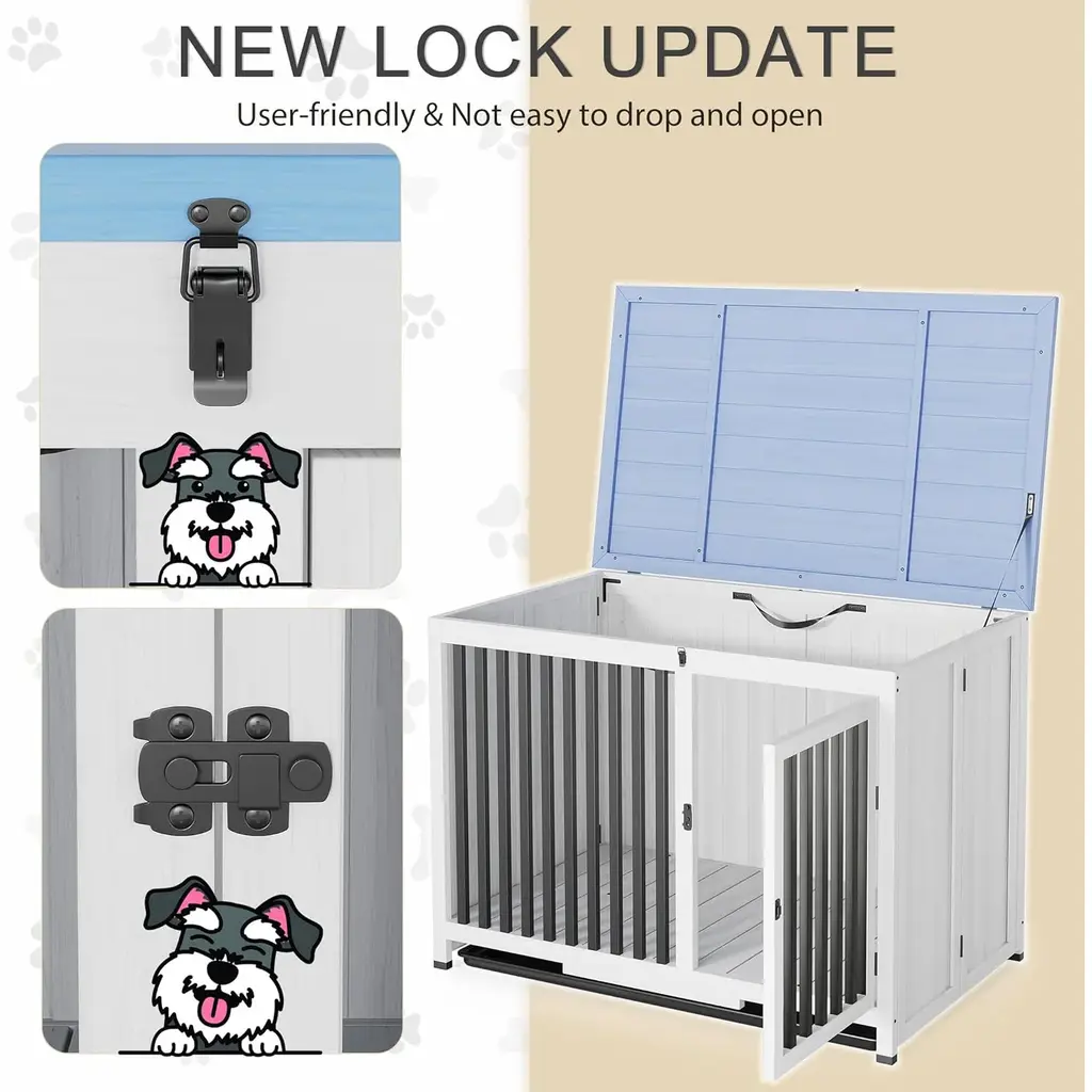 Portable Design: The dog crate table can be easily folded for convenient transportation to any desired location, whatever traver, camping. No-Assembly Needed: Once you take the wooden dog crate furniture out of the box, just cover the end table and the dog cage is ready. 2 Updated unescaping-Locks: Both the table and the door have upgraded locks to prevent pets from escaping. The end table and the door serve as two exits, facilitating interaction with the puppy and taking care of it. Multi-function wood dog crate: This furniture dog crate large dog can also serve as an elegant side table, end table, or buffet. Take into account both functionality and beauty, and can check on your pets at any time. Safety Upgrade: The spacing between the bars of the large dog crate furniture has been reduced from 2 in to 1.06 in to prevent puppies from getting stuck. Our Iron clad wooden doors more thicken, not easily bitten.