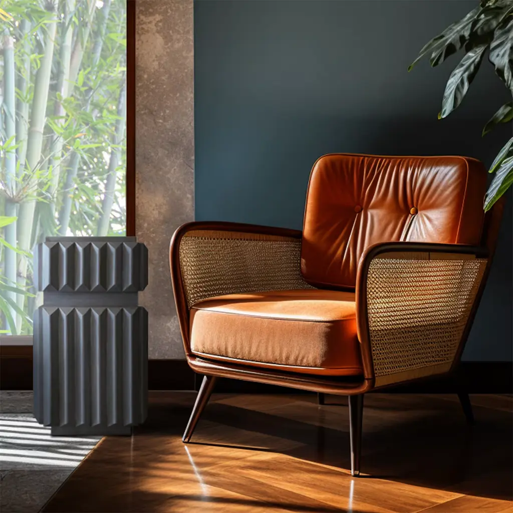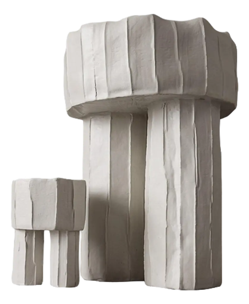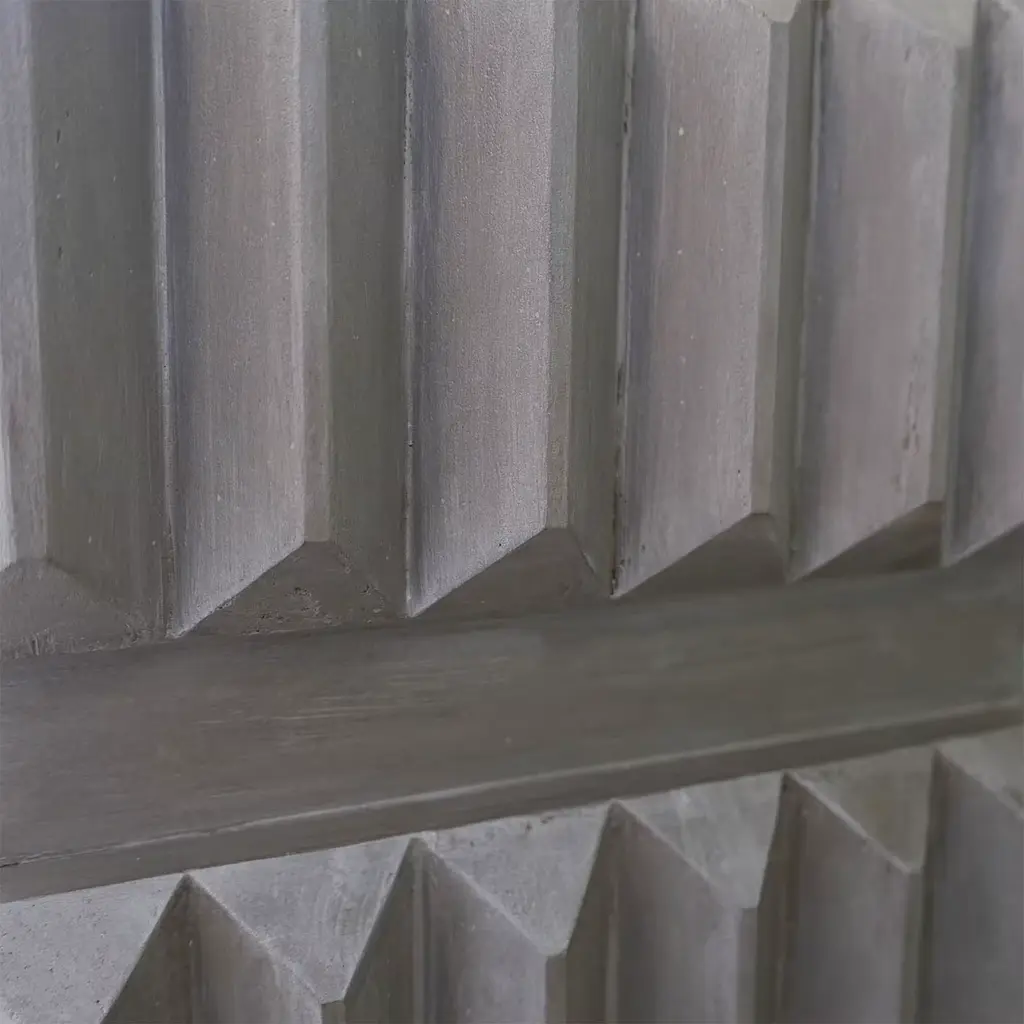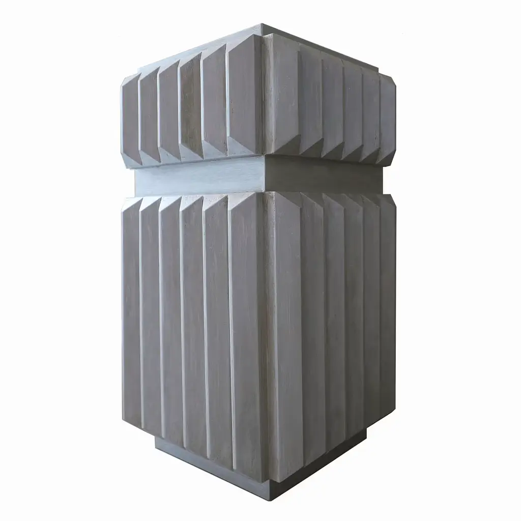 Portunus, with its shape and reliefs, evokes the millennia-old columns of the temple of the same name in Rome. This wooden cabinet stands tall and is made with a concrete finish decorated with a platinum tint. It can be customized with any color and used as a unique and distinctive side table in any corner of the house.