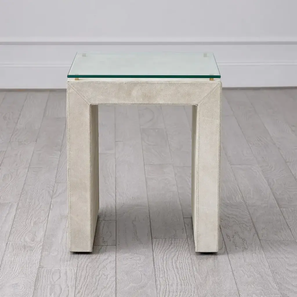 The Posh Console and Side Table are luxuriously wrapped in parchment suede leather blending practicality with sophistication in your living space. The collection features antiqued brass-finished hardware and a tempered glass surface. From a fashion forward perspective, Global Views offers accessories, furniture, statement lighting, and an assortment of rugs and mirrors to add beauty and joy to your home.