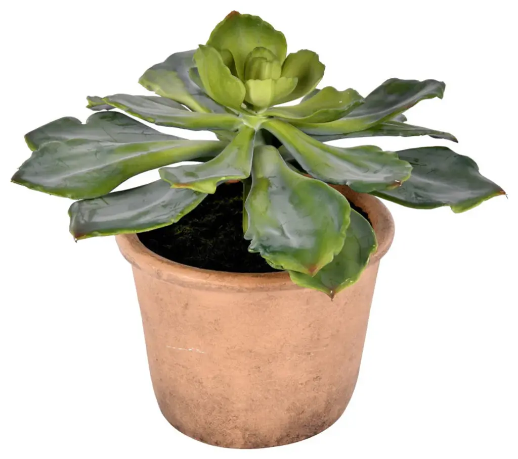 The Potted Dudelya Succulent features wide, curving leaves with realistic detailing that add a touch of green to any space. with its smaller size and classic black pot, this faux succulent makes a versatile additional to any home or office. Display on an office desk, entryway table, or end table for a sleek-yet-verdant look. Combine multiple plants with candles for a dining room tablescape.