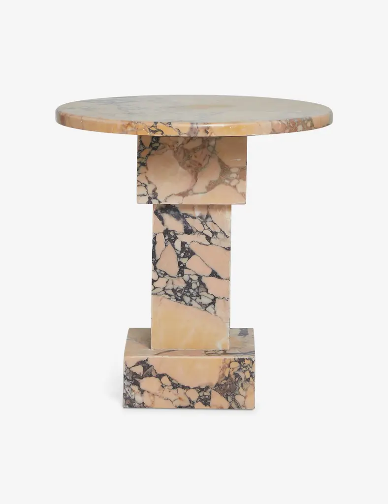 Our Potts side table offers a simple touch of sophistication. Clean lines cut a classic silhouette in the polished marble, showcasing the unique character of the colorful stone. Whether styled as an end table or a small pedestal for decor, this piece adds a luxe mineral warmth to the room.