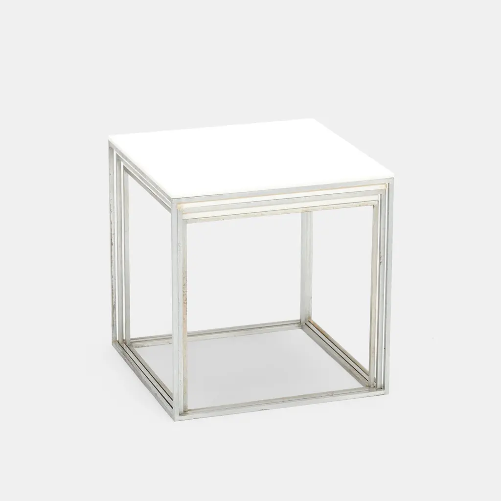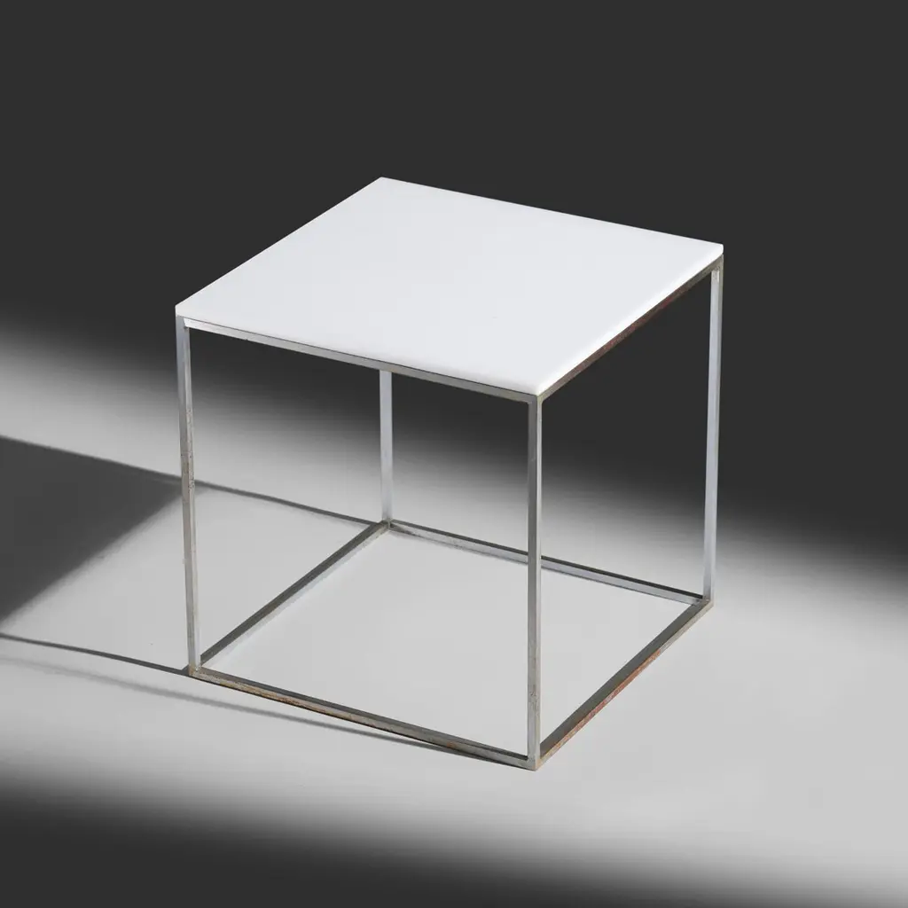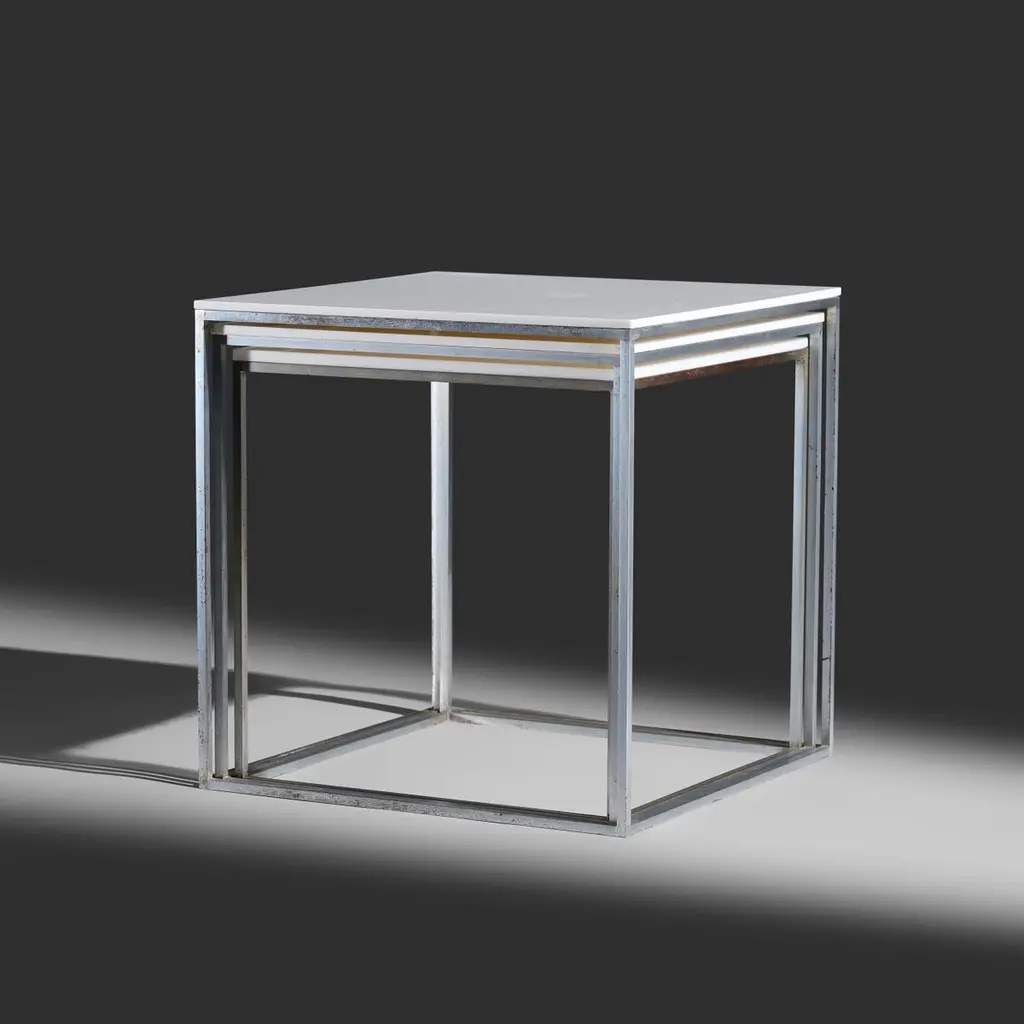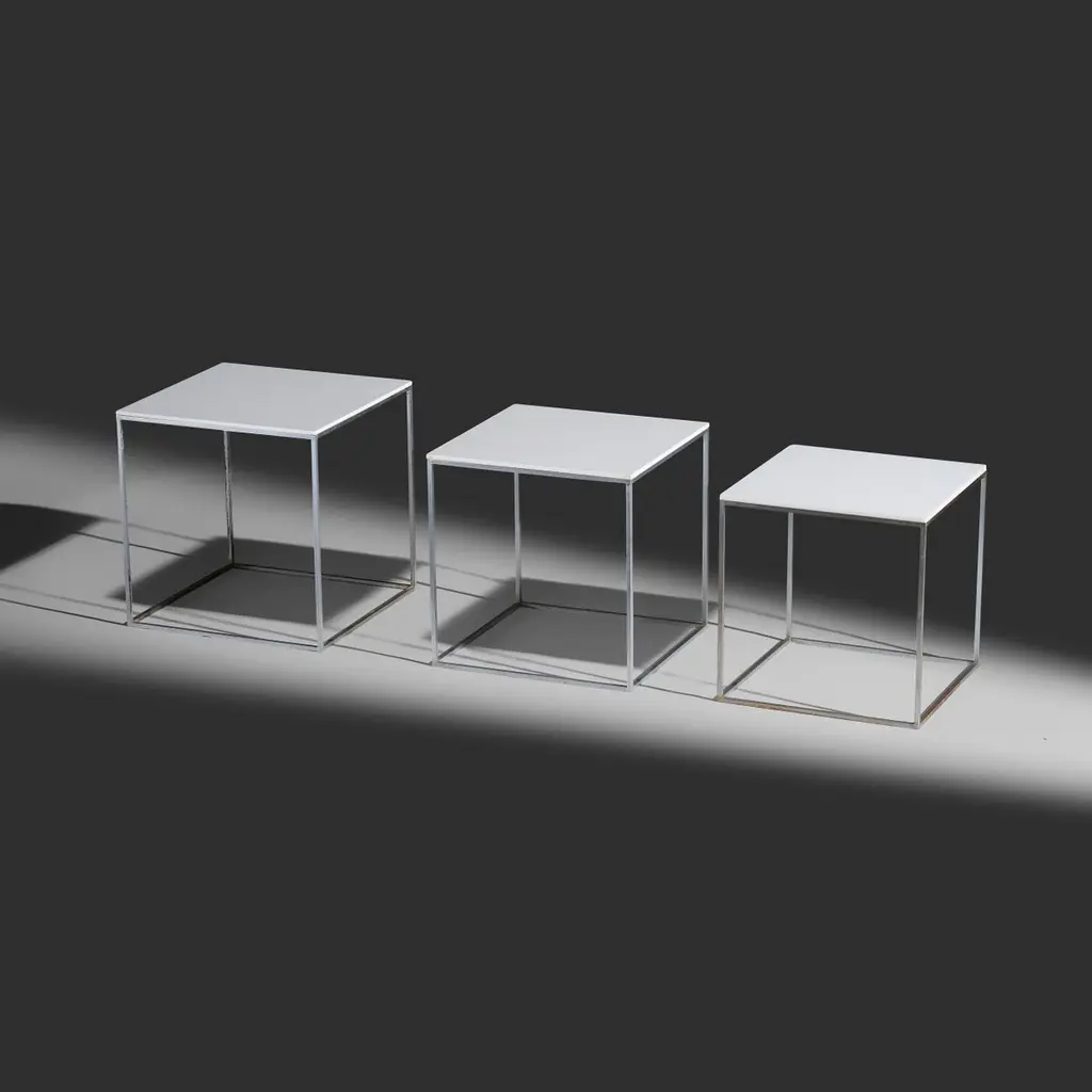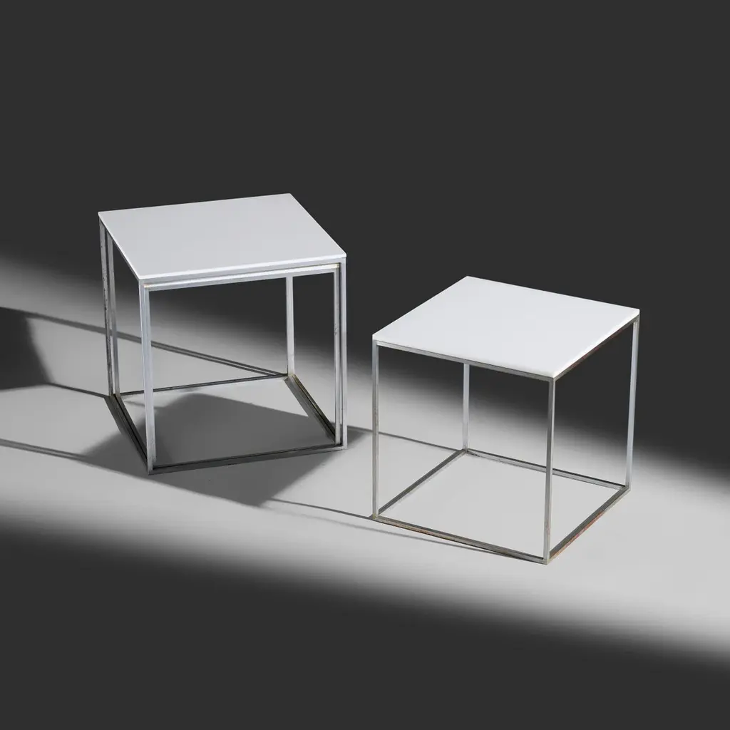 Poul Kjaerholm model "PK 71" nesting cube side tables produced by E. Kold Christensen, Denmark, 1957Dimensions: largest table measures 11 3/8" h x 11" w x 11" d Materials: matte chrome-plated steel, acrylic Condition: Very good vintage condition.