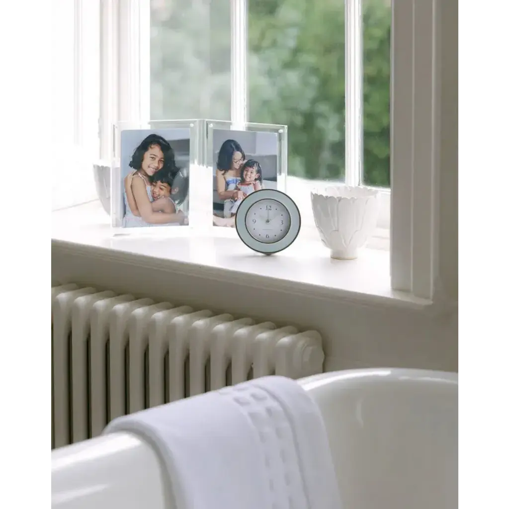 Our light blue enamel alarm clock beautifully compliments our enamel frames, complete with an alarm function, this clock is ideal for a bedside table or desk. Backed in luxury grey velvet with a silver clock movement cover.
