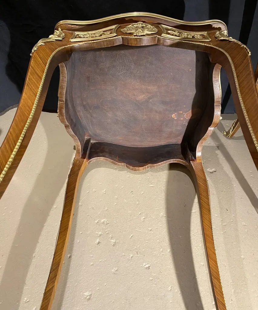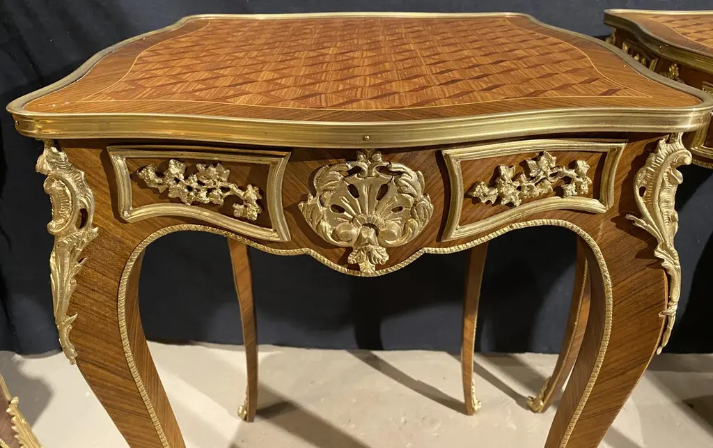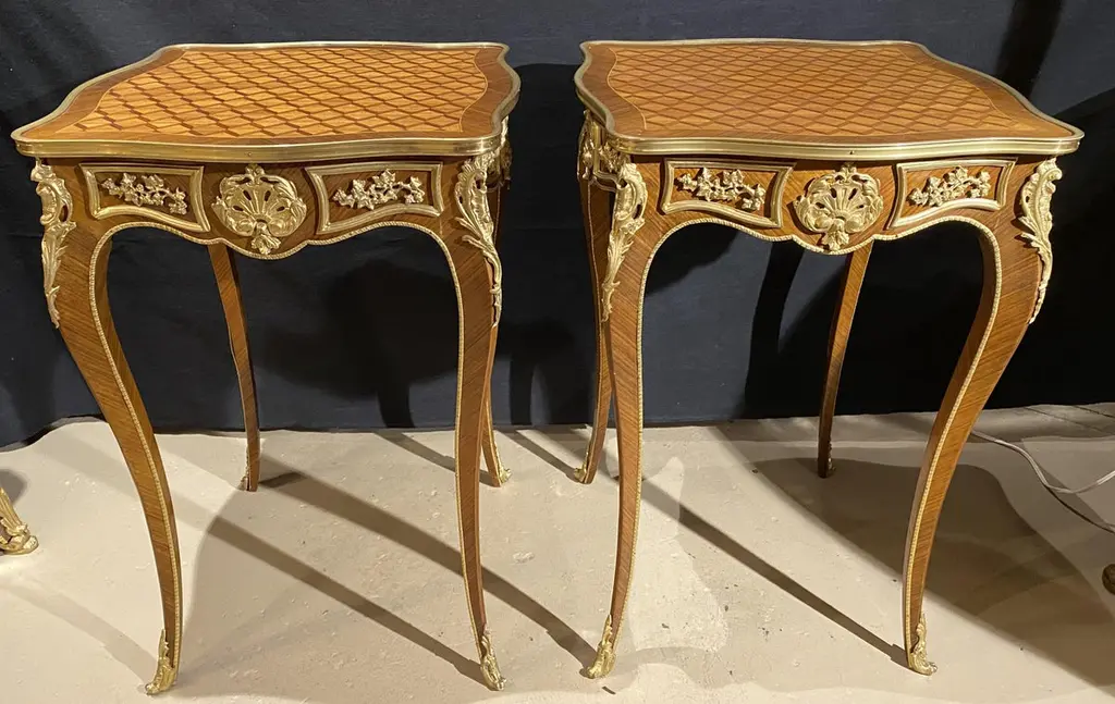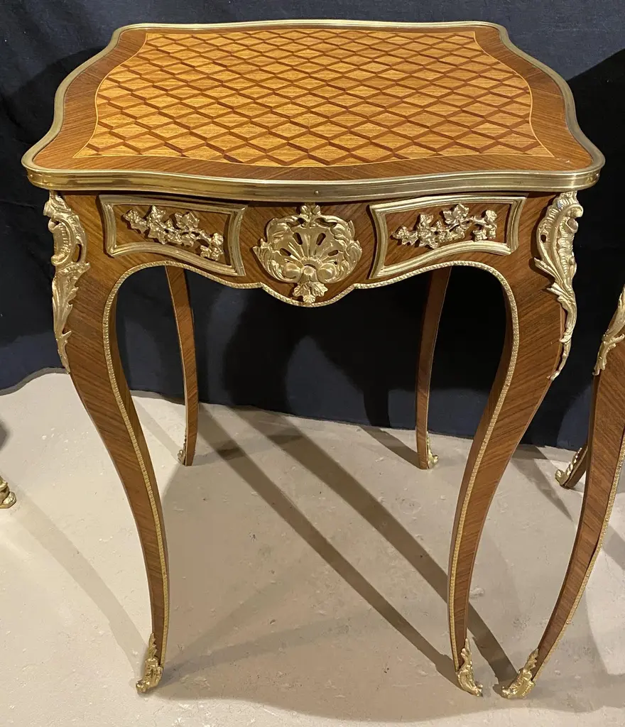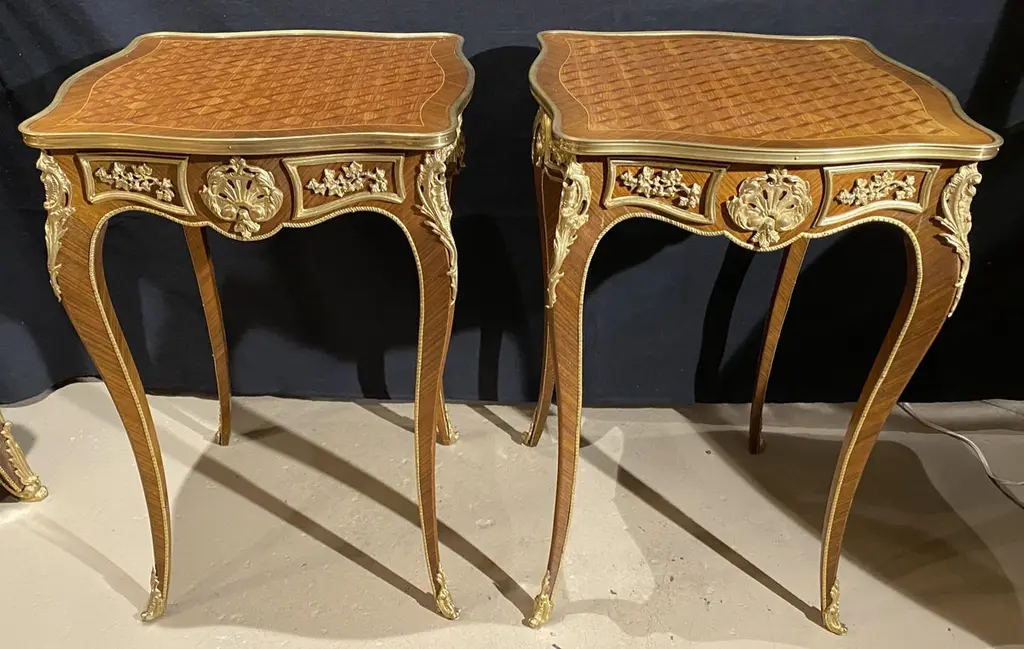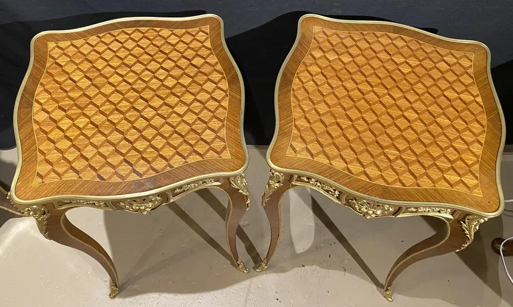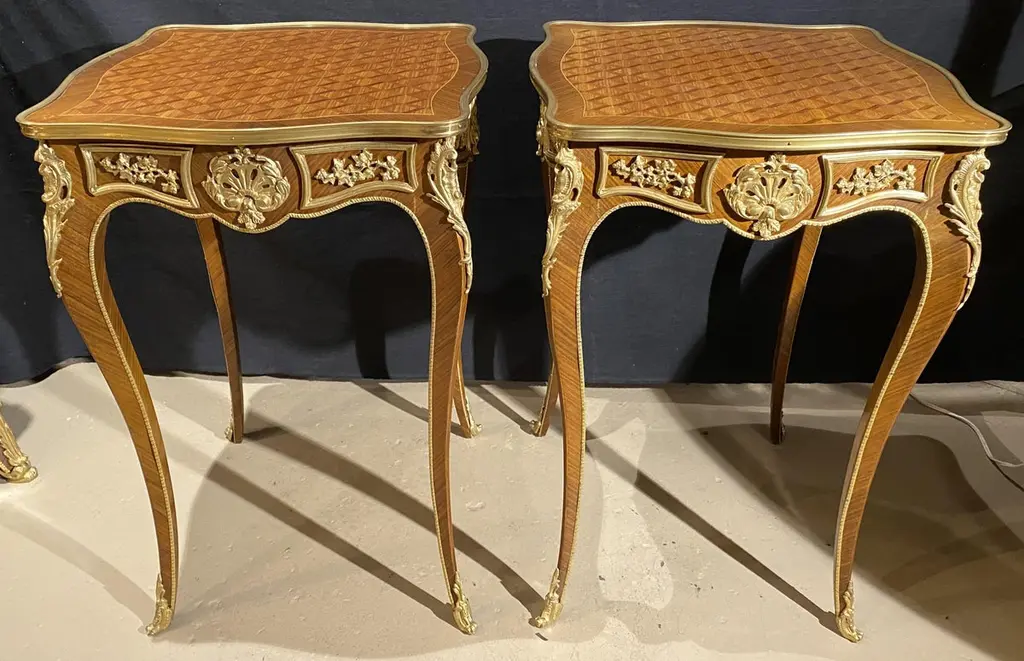 Pr Of Louis Xv Style Kingwood Parquetry Square Side Tables W/ Gilt Bronze Mounts
