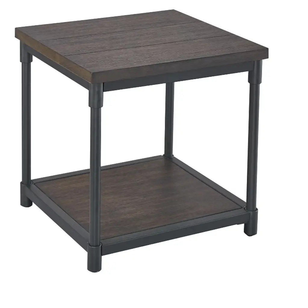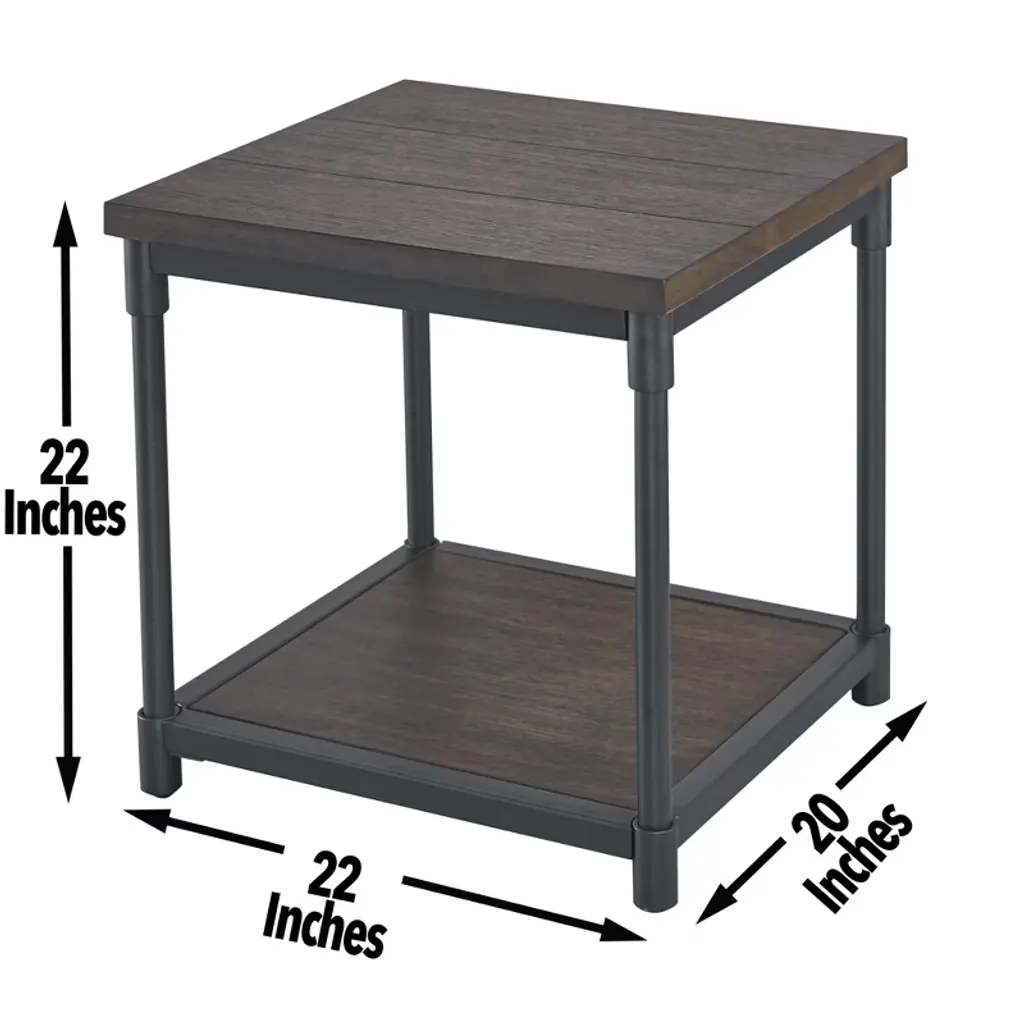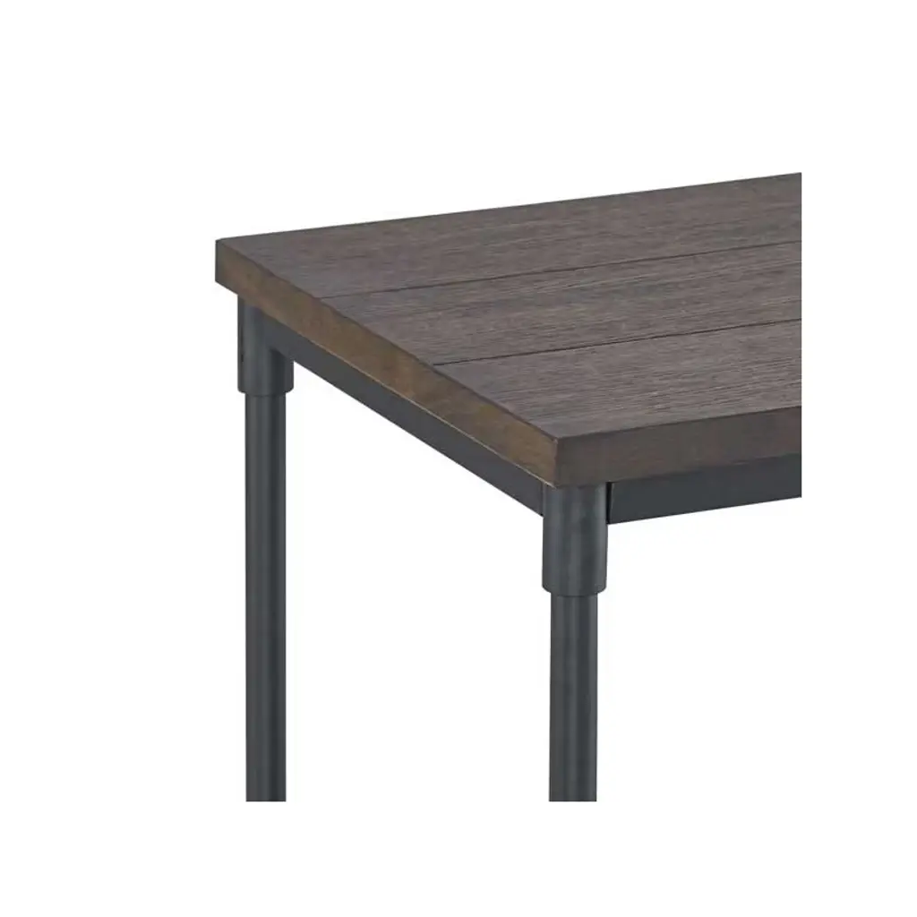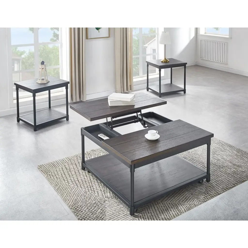 Table has plank effect that gives a rustic appearanceConstructed of oak veneers and iron postsCocktail table features one-half lift-top for easy access and is castered for mobilityTables have a plank effect top that gives the set a rustic appearanceMatching end tables complete the collectionSmoky oak finish