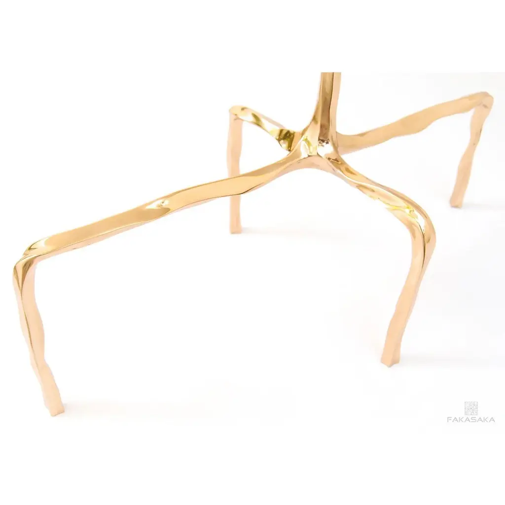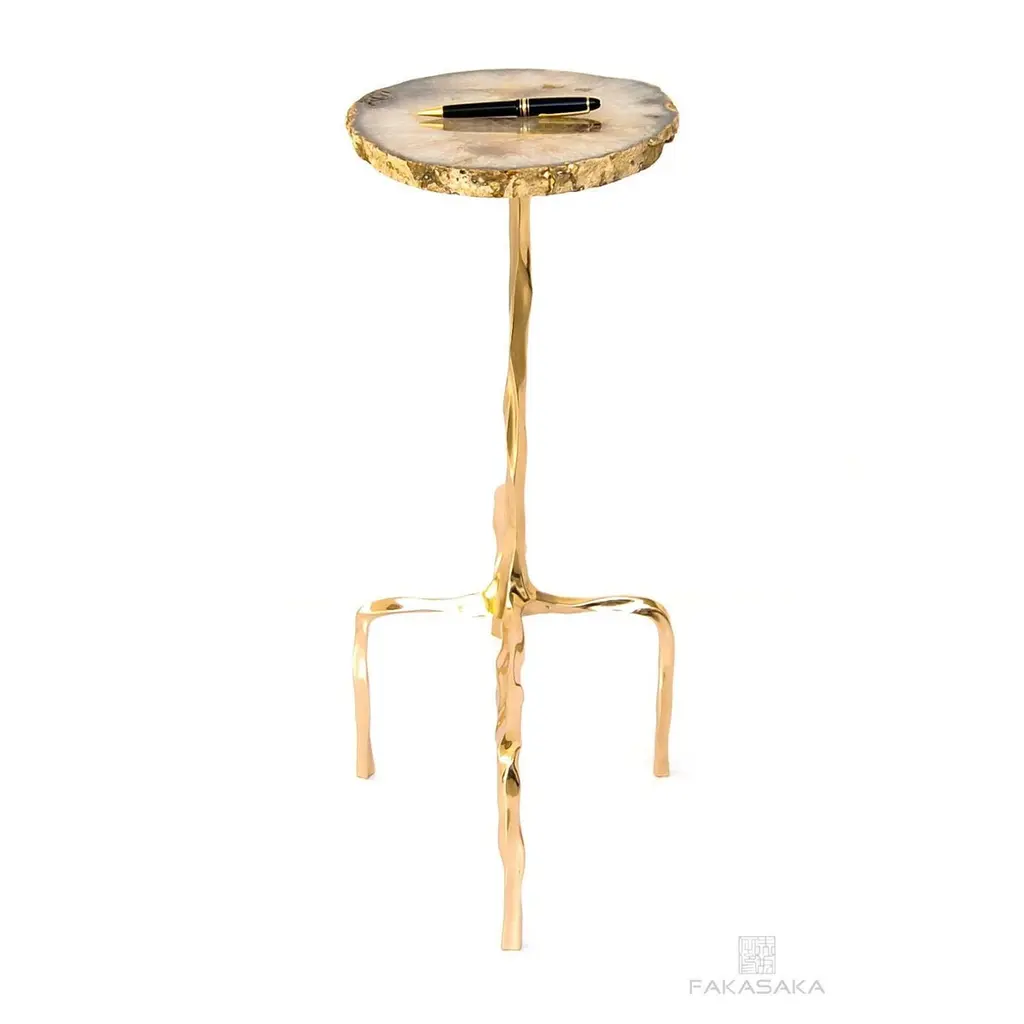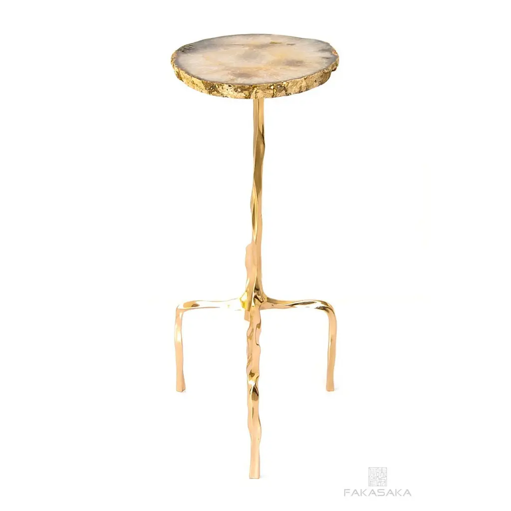 Presley drink table with Agate top by Fakasaka Design.Dimensions: W 58 cm D 28 cm H 60 cm.Materials: polished bronze base, Agate top.Also available in different table top materials (Nero Marquina). FAKASAKA is a design company focused on production of high-end furniture, lighting, decorative objects, jewels, and accessories. Established in 2007, Fakasaka is the eponymous design company by Brazilian artist Fernando Akasaka distinguished by a penchant for producing intricate detailed cast bronze collectible design objects, furniture and jewelries. Fakasaka explores the contrast between the manmade and the natural through shapes and finishes that create a clear aesthetic. The constant challenge to balance elements is met with an outcome that is a striking assortment of bronze furniture and objects in oxidised and polished finishes, accented with precious regional stones, granites and rich prehistoric reptilian motifs.