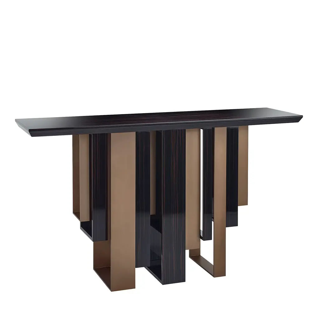 Propeller Console Table — Steel & Brass Base — Bullnosed Oak Top