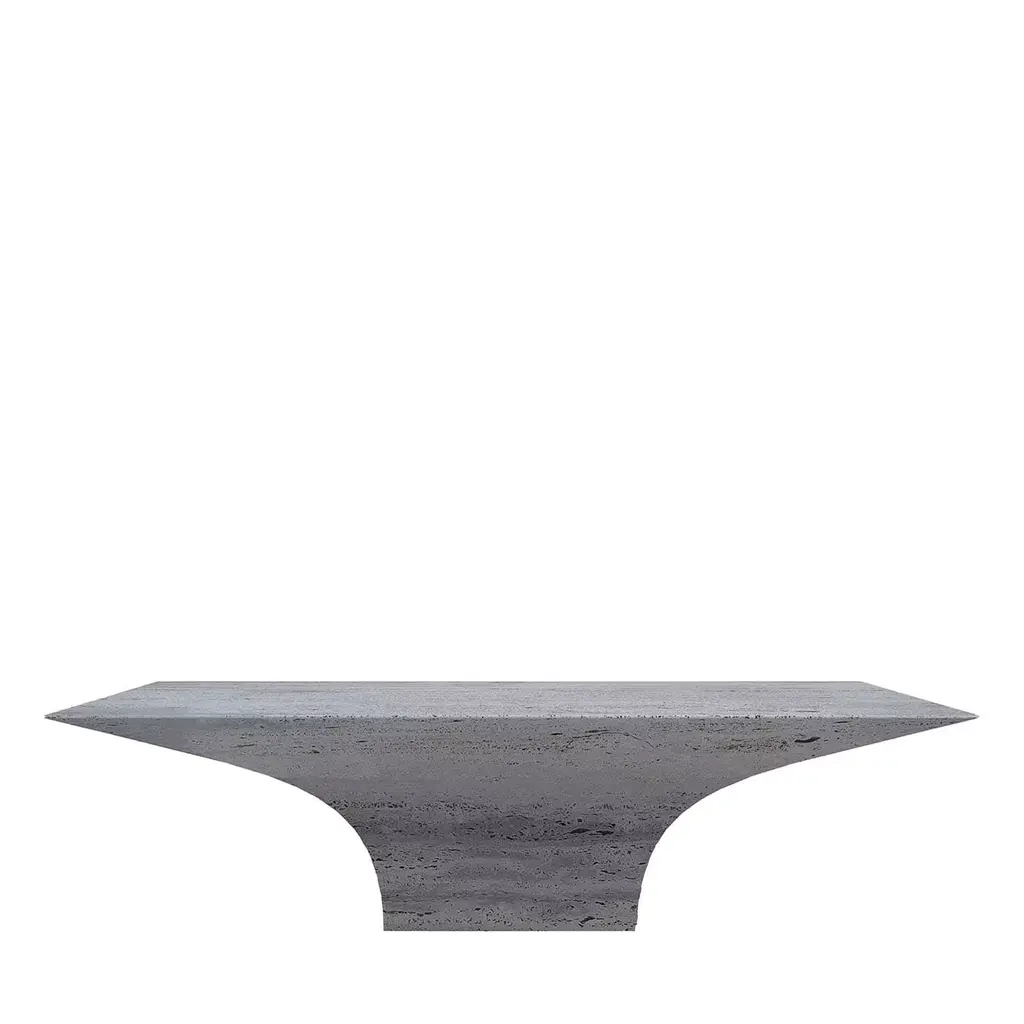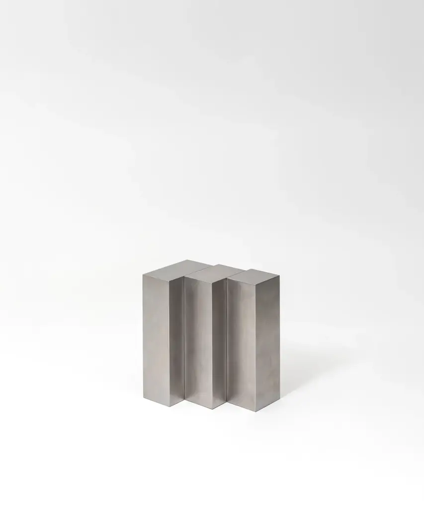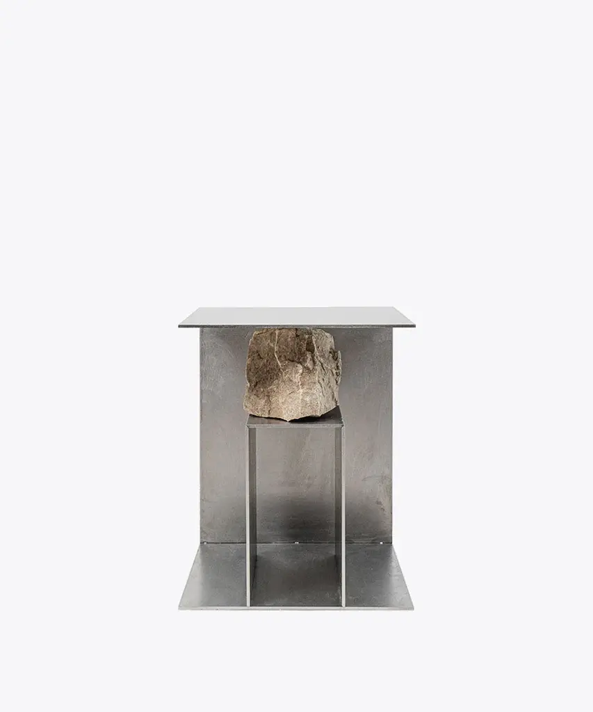 Primitive forms combine with industrial materials to create the 'Proportions of Stone' series by Seoul-based designer Sisan Lee. Consisting of functional pieces including tables, chairs, and shelving, ÔProportions of StoneÕ combines primitive, natural forms of stone with industrial and futuristic structures of steel. The strong, geometric steel against the organic stone reveals an arresting juxtaposition of elements, simultaneously highlighting and questioning materiality. For Lee, the stone is the starting point for each piece and this is evident throughoutÑthe steel appears to have formed around the organic object, mimicking the natural construction of its counterpart. Stone and steel both symbolize strength and structure however the process of their making is very different. Steel, forged by heat and human intervention, is often sleek and precise in its finished state. Stone however, could be regarded as the epitome of natural forms; it is carved by the elements over thousands of years. Bringing together these natural and artificial elements could easily appear incongruous but in LeeÕs work it is harmonious, with both elements appearing to strengthen one another. This unexpected balance also contributes to the structural integrity of the piecesÑthe stones provide weighted support, ensuring they stay grounded. This contrasting of elements is brought together through shared functionality: with each piece, Lee highlights a distinct visual tension whilst emphasizing a delicate coexistence. Each piece is made-to-order and uses scavenged stones, so please expect some variability in design. Designed and produced by the Seoul-based Sisan Lee.