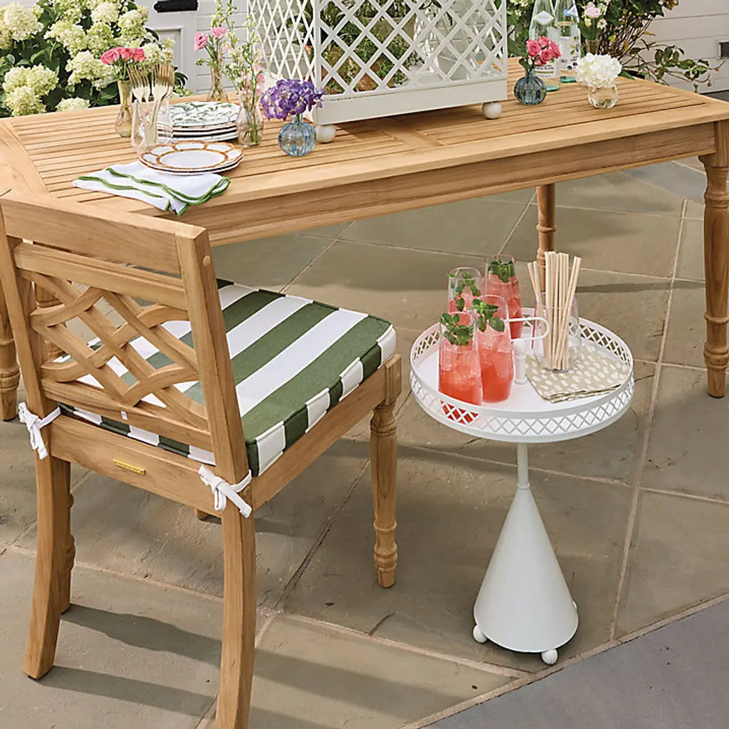 This whimsical little accent table goes wherever you and the party take it. Our Prospect Side Table is handmade of outdoor-safe, powder-coated steel with round top encircled in an airy trellis gallery. The turned finial is fitted with an open handle for quick, easy placement wherever you need to park a drink. Fun inverted cone base is raised on petite ball feet. Prospect Side Table features: