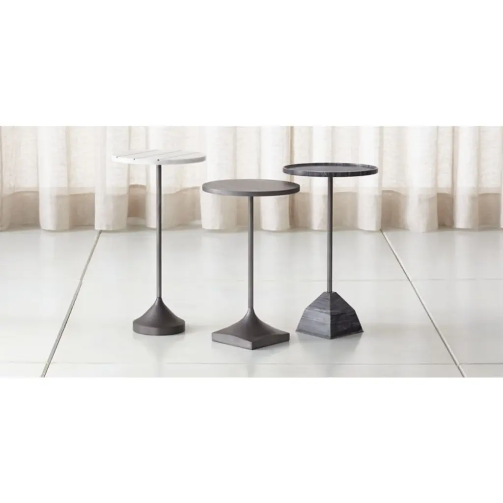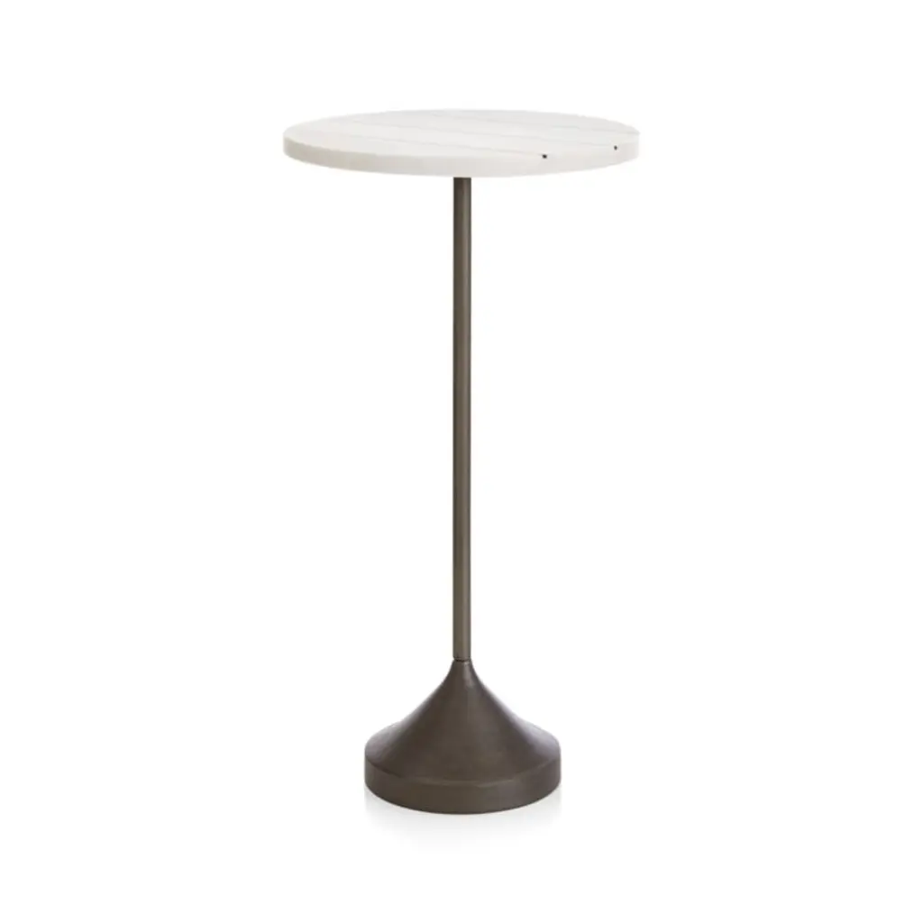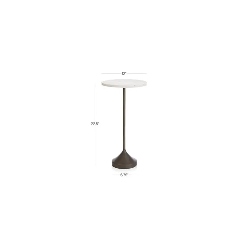 Named for the German word for "cheers," this fun-loving table rises to the occasion with a charming shape and size. Rising high on a slender column anchored by a sculptural antiqued metal base, the table provides a round tabletop of white Banswara marble inlaid with stripes of brass. Partner with an arm chair or create a cluster with coordinating small and medium Prost tables, each with their own unique mix of materials. The Prost Tall Brass and Marble Drink Table is a Crate and Barrel exclusive.