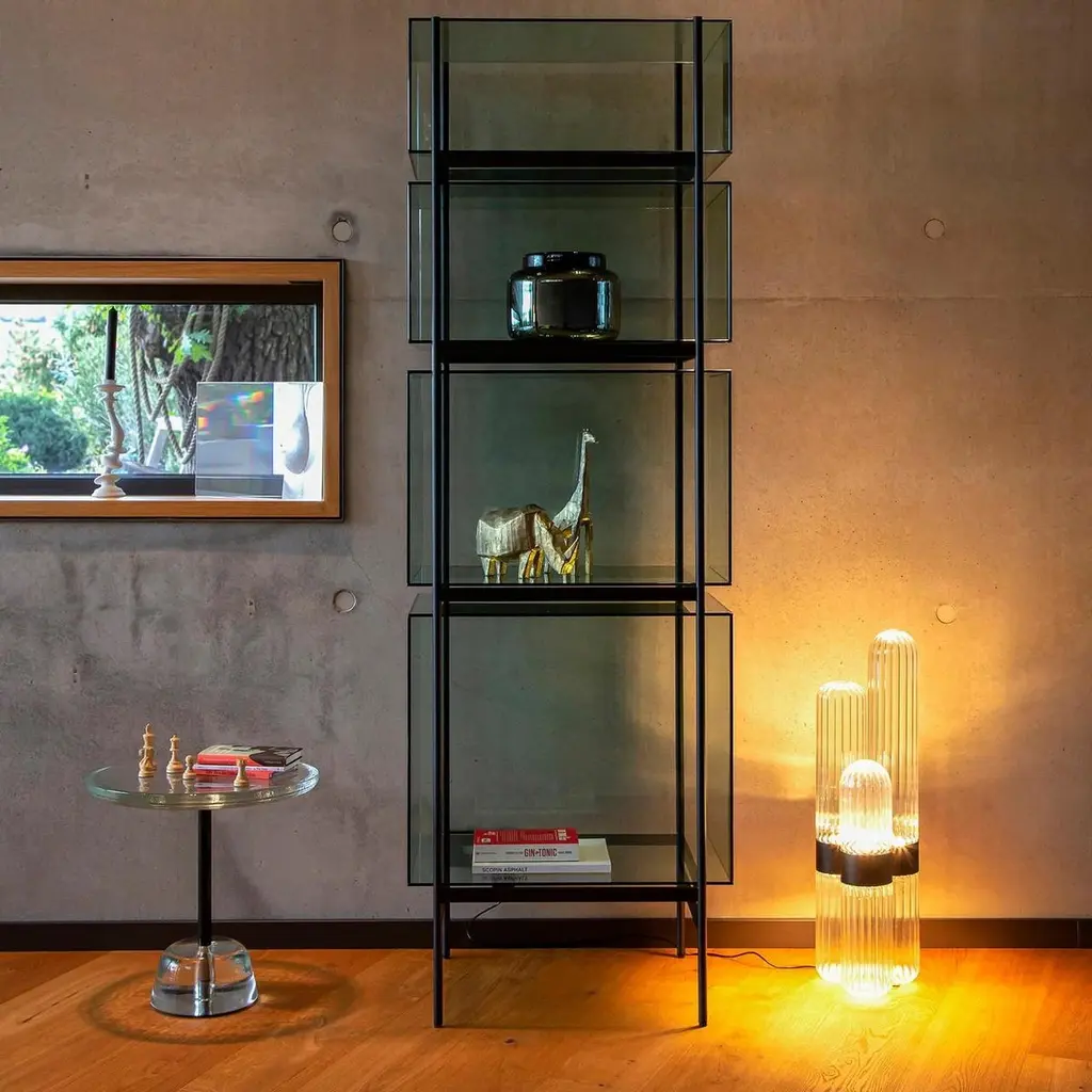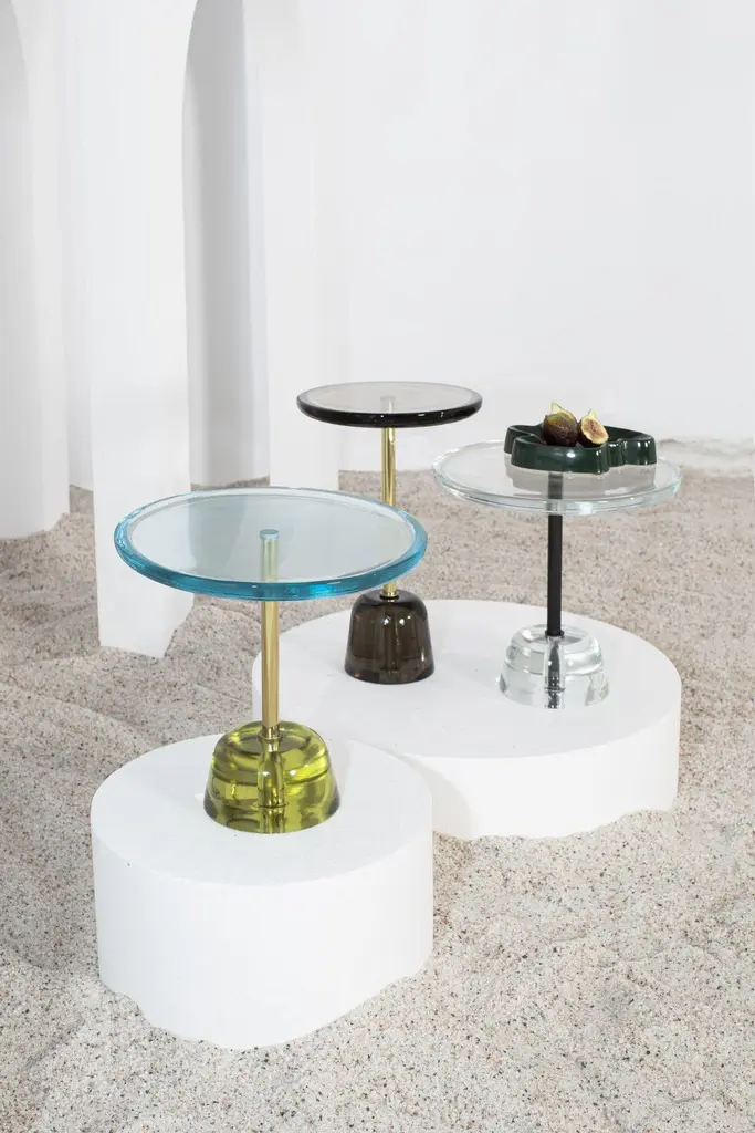 Sebastian Herkner’s distinctively tall, skinny side table series pina is inspired by the abstract turns and twists of the famous Pina Bausch dance theatre. The basic figurine with base, rod and top shines in different combinations of aqua blue, transparent, green and light grey.Material: casted glass, brass and steeltop colourtransparent, light grey, green, corn yellowrodblack, brassfoot colourtransparent, light grey, green, corn yellow