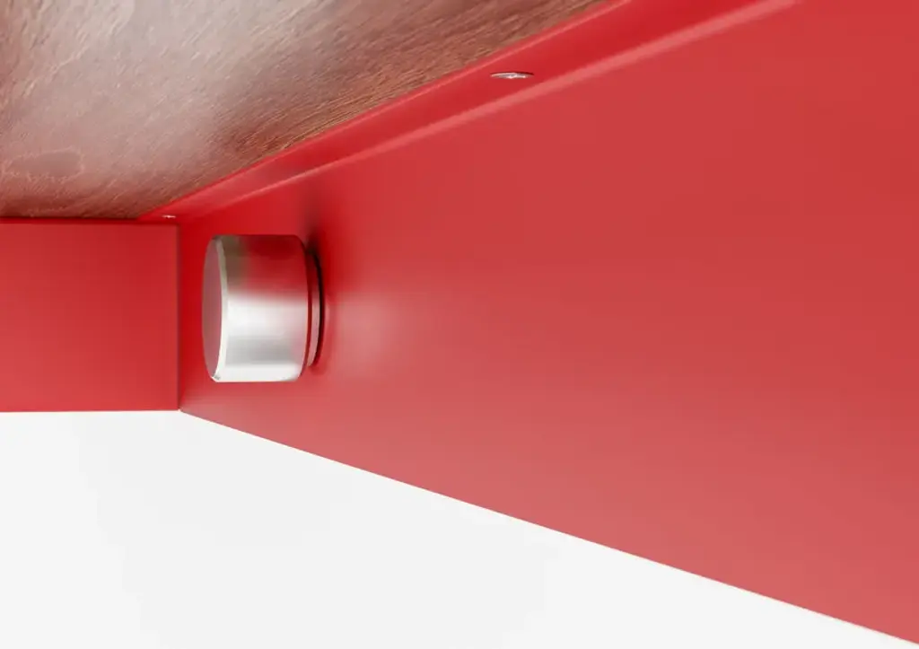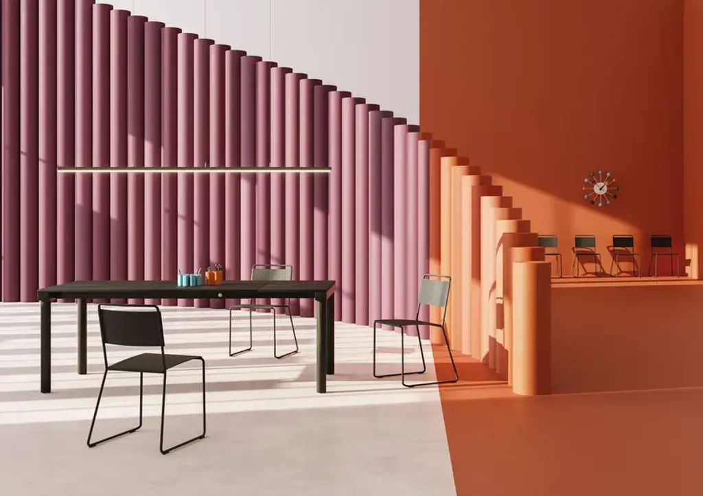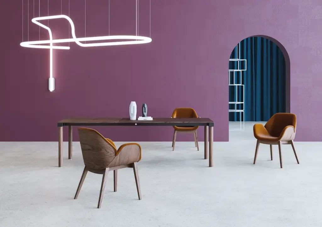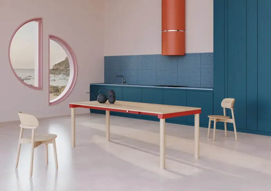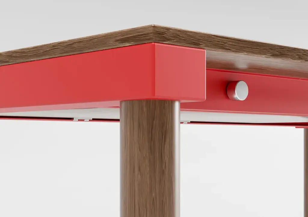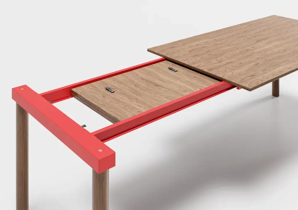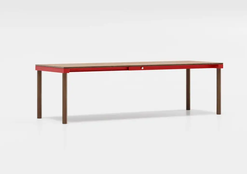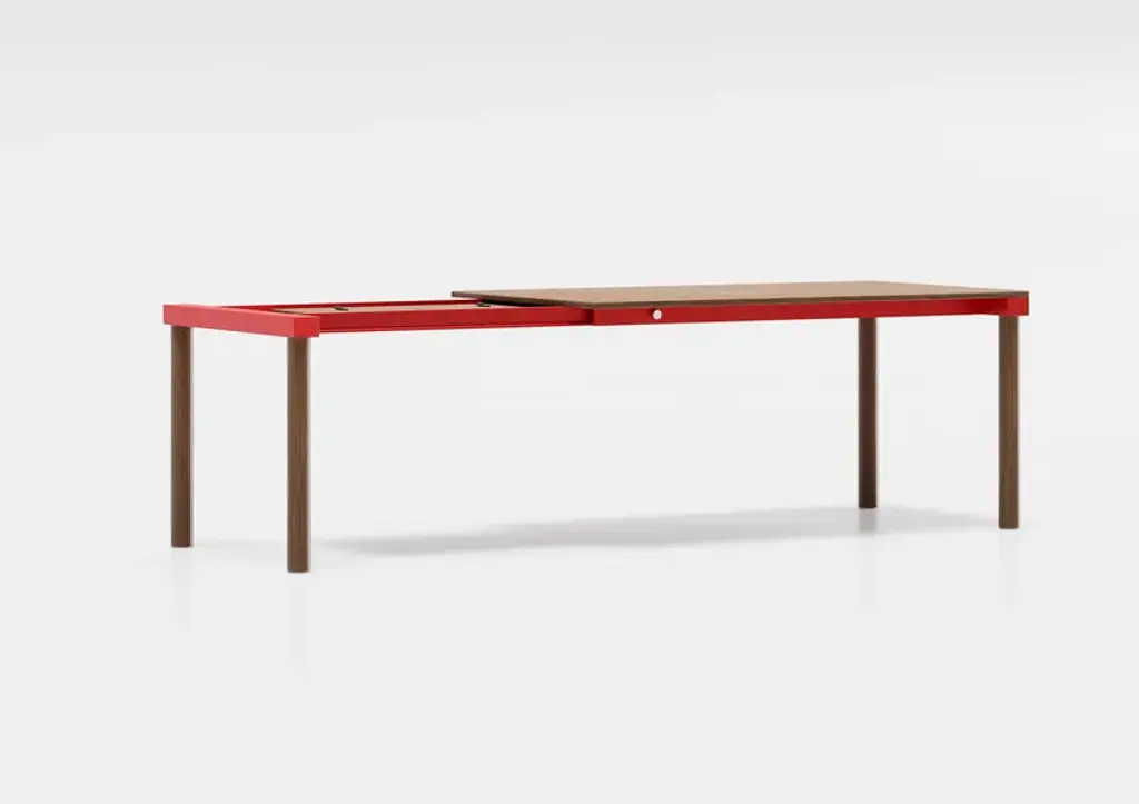Puntoquadro extending table is born from simple and harmonious geometric shapes, characterised by an original contrast between square and round. The lines are embellished with chromatic accents, which give the functional simplicity of this table a strong character of a true protagonist. The traditionally hidden aluminium rails are proudly displayed here in red or matt black lacquered versions. Made entirely of wood and equipped with legs with a large diameter, Puntoquadro is a rich and aesthetically balanced table that infuses the room with a warm and welcoming atmosphere.