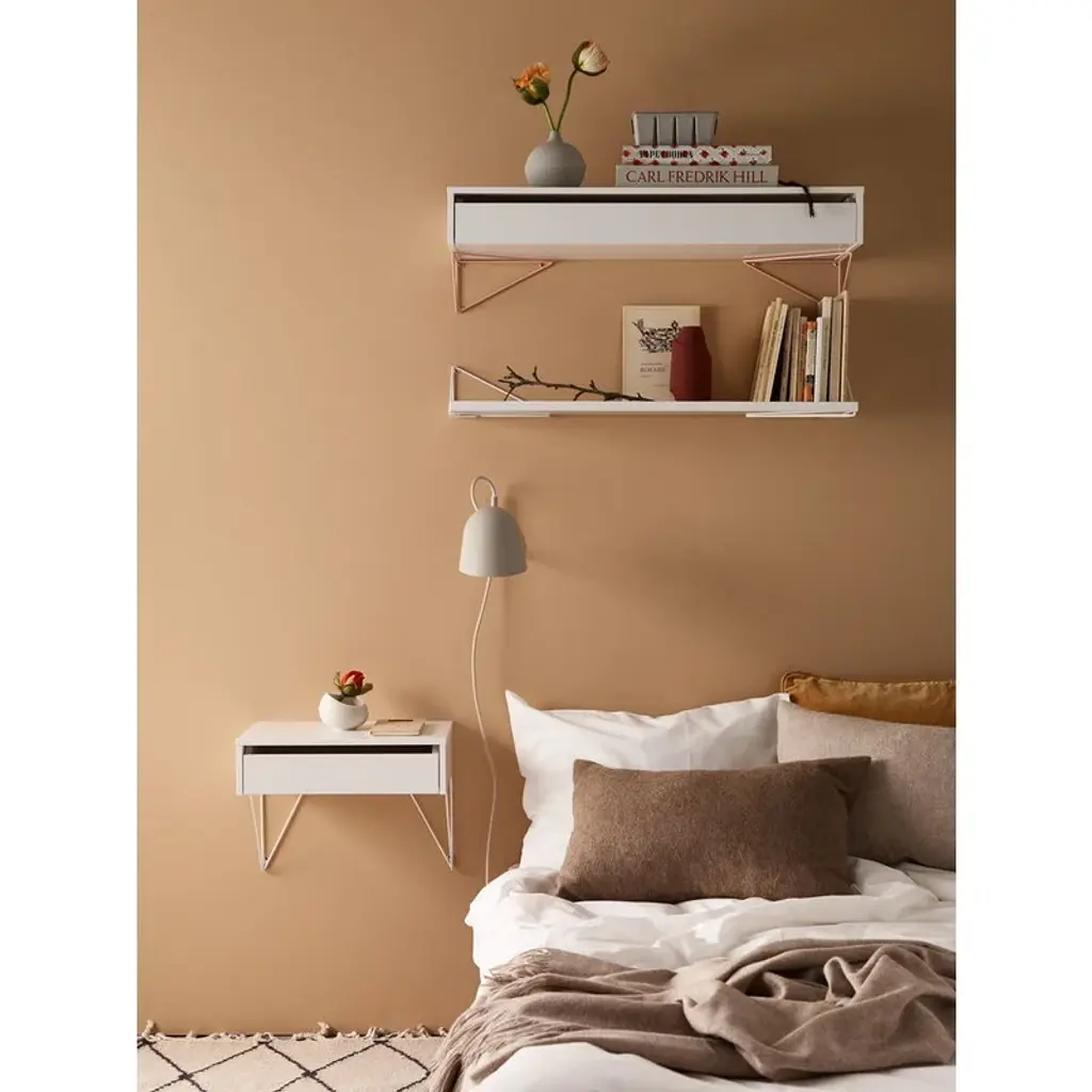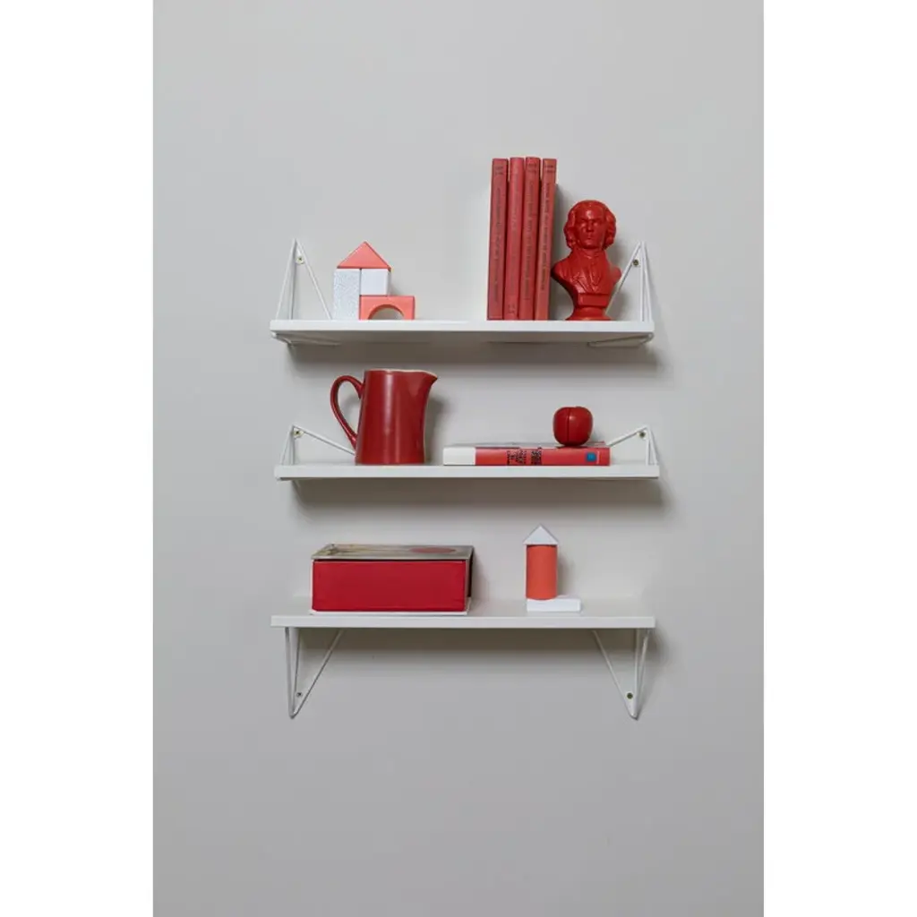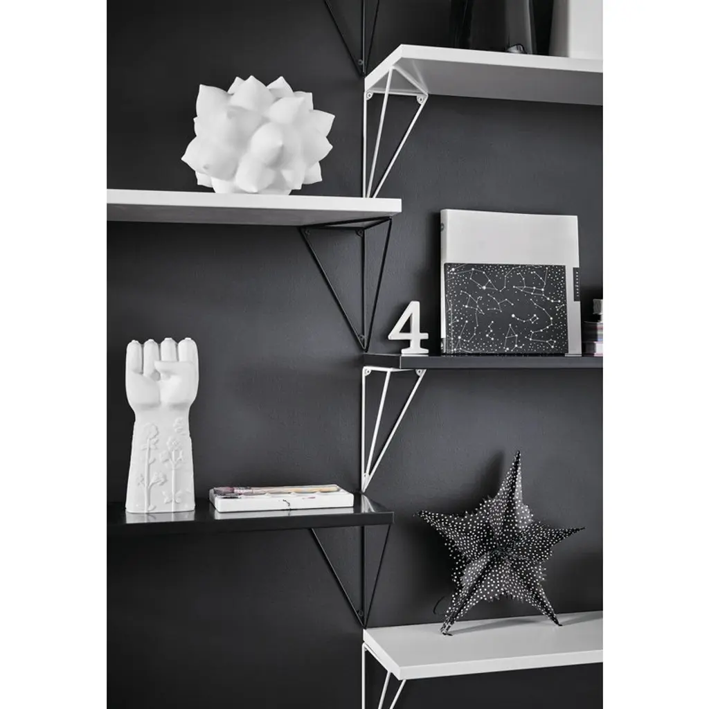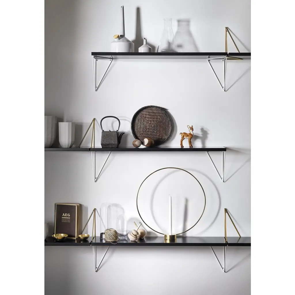 Pythagoras brackets by the Swedish brand Maze are part of a unique shelving system which combines the preciseness of mathematics with the creative possibilities of design. Designed by Gustav Rosén, the Pythagoras collection was inspired by the Pythagoras' triangle theorem, making a triangle the base and most essential element of the shelving system. Pythagoras wall brackets, shelves, and drawers give you the freedom to create shelves of various sizes, colors, and shapes in any space. Use them to build a single wall shelf, bedside table, corner shelf, set of kitchen drawers, or a large shelving module covering an entire wall. The wall brackets can be mounted either below or above the shelf or drawer in four different positions, and their airy design leaves room for blank space as well. Play, experiment, and create the perfect shelf for your own needs! The wall brackets are designed to fit the shelves and drawers of the Pythagoras collection, but it is possible to use them with other shelves as well – the recommended shelf dimensions are 31.5 x 7.87 x 0.75 x 0 in (800 x 200 x 19 x mm. mm). The brackets are made of 100% recycled metal.