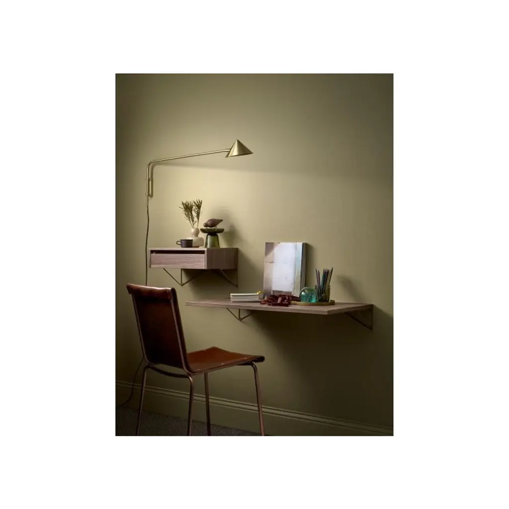 The Pythagoras desk by the Swedish brand Maze is part of a unique shelving system which combines the preciseness of mathematics with the creative possibilities of design. Designed by Gustav Rosén, the Pythagoras collection was inspired by the Pythagoras' triangle theorem, making a triangle the base and most essential element of the shelving system. Pythagoras wall brackets, shelves, and drawers give you the freedom to create shelves of various sizes, colors and shapes in any space. Use them to build a single wall shelf, bedside table, corner shelf, set of kitchen drawers, or a large shelving module covering an entire wall. The wall brackets can be mounted either below or above the shelf or drawer in four different positions, and their airy design leaves room for blank space as well. Play, experiment, and create the perfect shelf for your own needs!