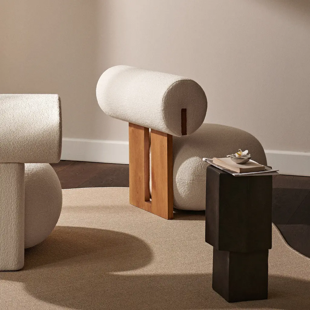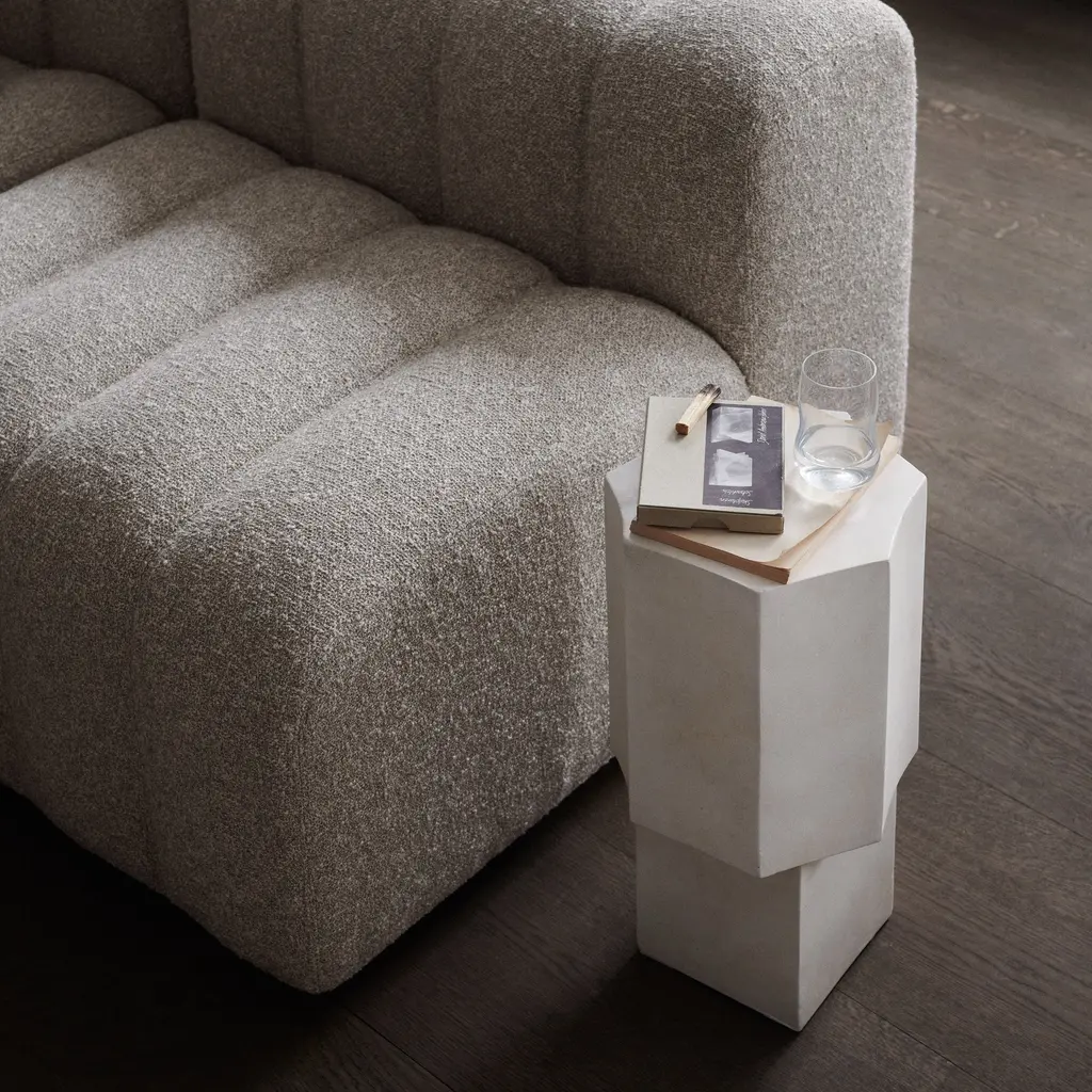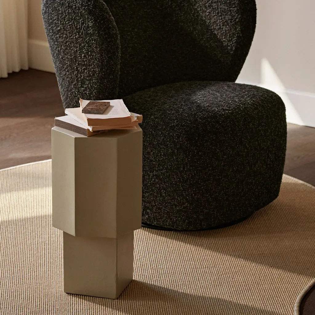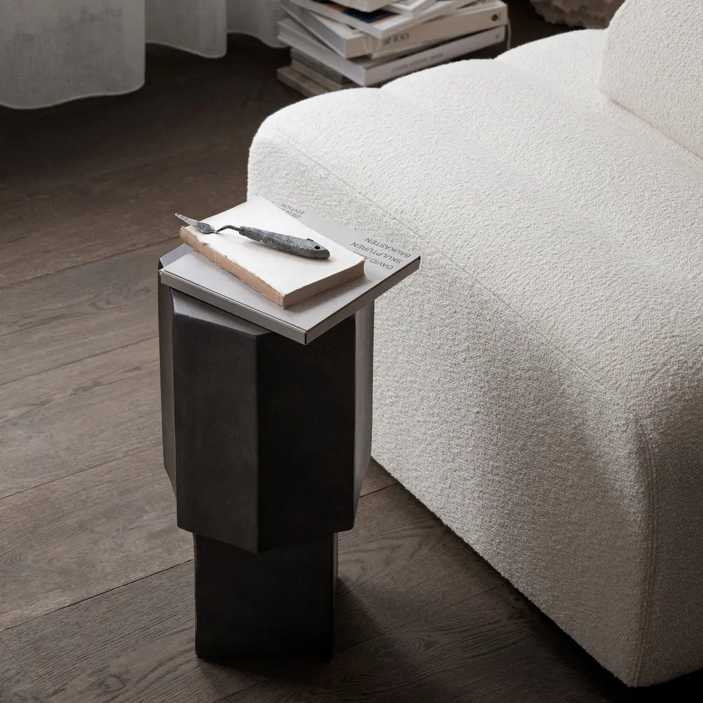 Inspired by the natural form of quartz crystals, the Quartz Side Table changes its appearance depending on the angle from which it is viewed. It is crafted from hand-painted reinforced fiber concrete, giving it a tactile and unique texture. The Quartz Side Table can function as a side table, podium, or standalone decorative object, available in colors Earth, Chalk, Maroon, and Mineral.
