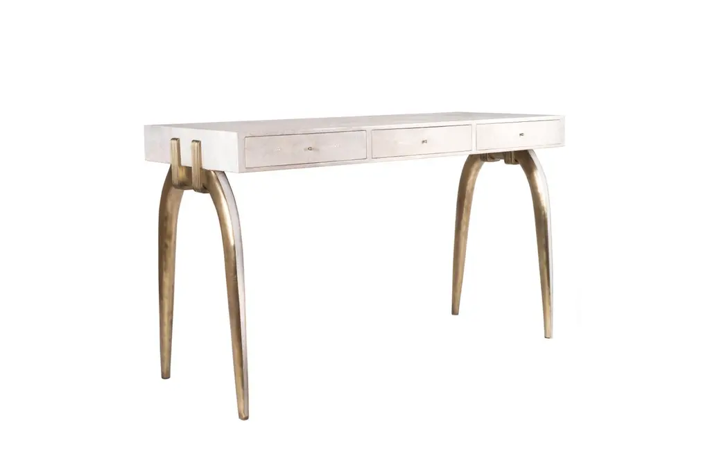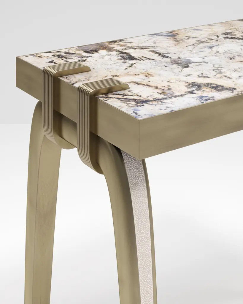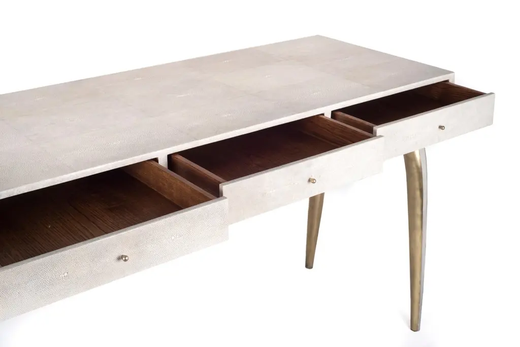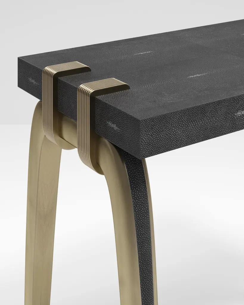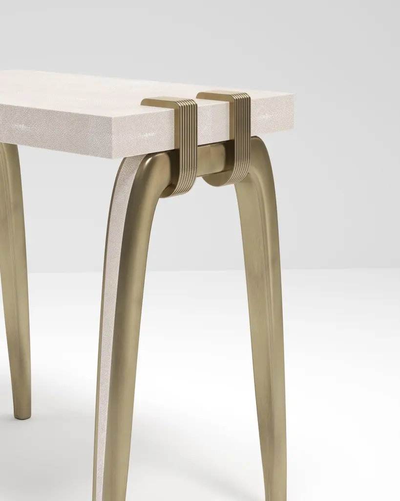 The Paris based label has distinguished themselves since their launch, with their iconic use of shagreen mixed with brass and other exotic materials. All furniture is handcrafted by skilled artisans, ultimately making each piece unique, designed in Paris and produced in the Philippines.The Sonia side table is an iconic Augousti design, showcasing the exquisite craftmanship behind the brand. The shagreen inlaid legs clasp onto the side of the quartz rectangle top. This piece is a nod to the Art-Deco period while remaining contemporary in it’s design. Available in different finishes and as a console and desk, see images at end of slide. Custom sizing / finishing available in requestMeasures: 60 x 35 x 60 cm.All R & Y Augousti pieces are handmade by artisans, ultimately making each piece unique. Custom color/sizing available on request. Wipe clean with soft dry cloth.Acclaimed design duo Ria & Yiouri Augousti have established themselves since the 1990s as pioneers of modern-vintage style through their luxurious Art Deco inspired collections.The Paris based label has distinguished themselves since their launch, with their iconic use of shagreen mixed with brass and other exotic materials. All furniture is handcrafted by skilled artisans, ultimately making each piece unique. All shagreen-covered items should be kept out of direct sunlight, color variants may occur on the stingray and other exotic finishes, but this showcases the Parisian label's commitment to creating authentic luxurious products using natural components.