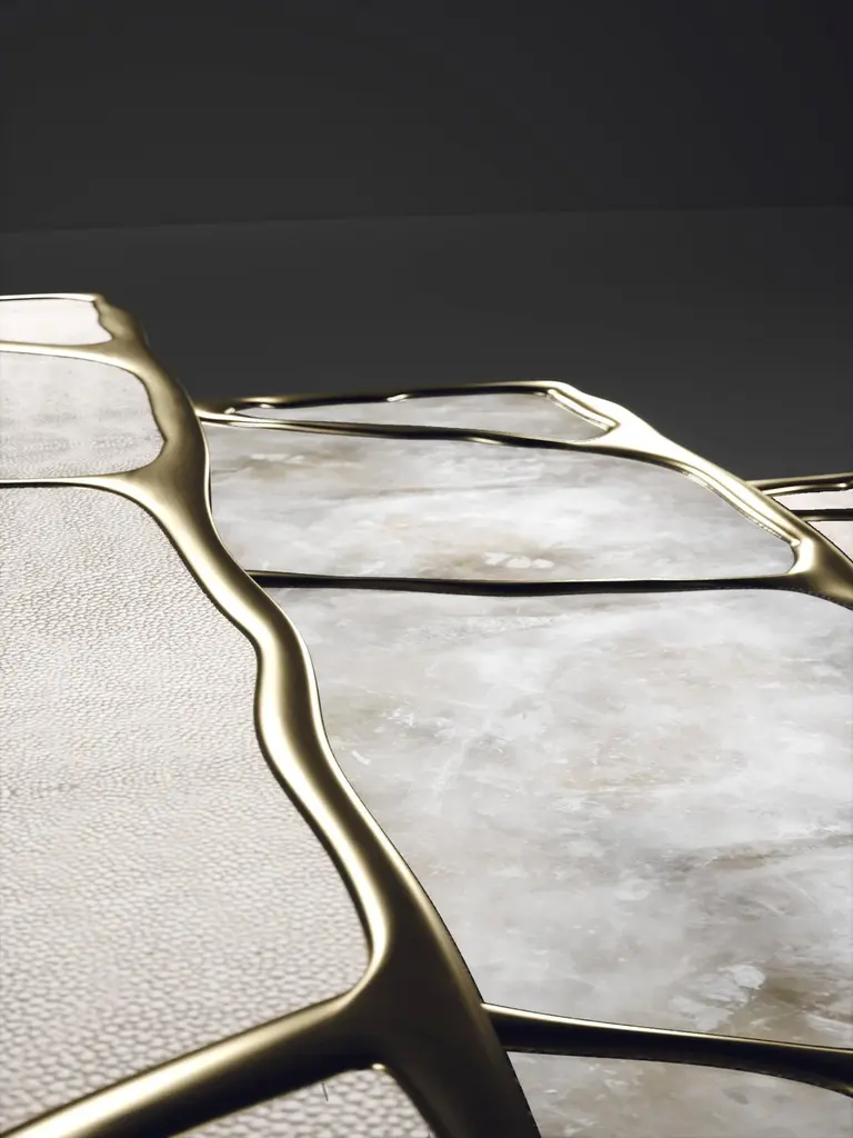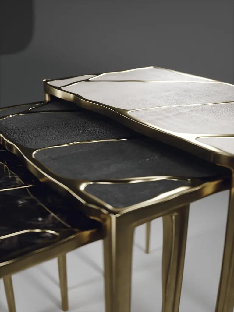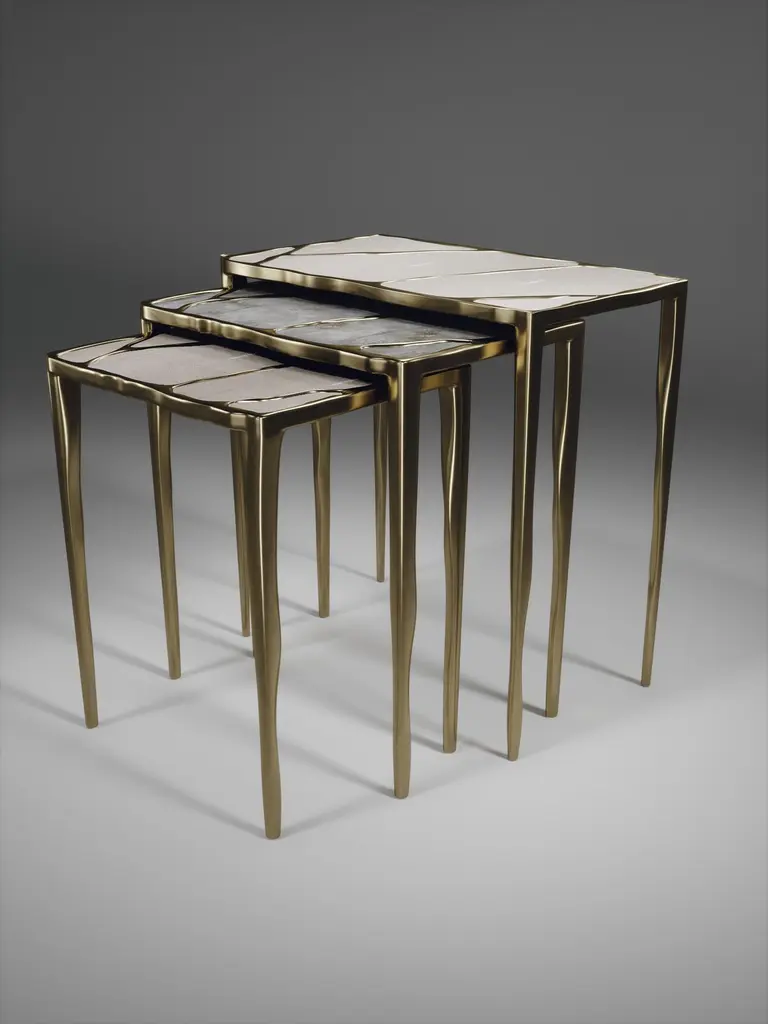 The Paris based label has distinguished themselves since their launch, with their iconic use of shagreen mixed with brass and other exotic materials. All furniture is handcrafted by skilled artisans, ultimately making each piece unique, designed in Paris and produced in the Philippines.The Melting II nesting side table medium, is the perfect accent piece for any living space. These are sold either as a set of 3 to create elegant and geometric shapes, or individually. This listing is for the medium size only. The top is inlaid in white quartz and framed with an irregular surface bronze-patina brass that continues as a pattern on the top surface as well as the shape of the legs, which creates the "melting" effect against the inlay work. The melting pattern on the top surface is only raised by 3mm. Available in different finishes, see images at end of slide.The dimensions of this piece are Medium- 20.5 x 13.75 x 19.75"The dimensions of the other pieces in the set are:Large- 23.5 x 13.75 x 23.50"Small- 17.25 x 14 x 20.75" All R&Y Augousti pieces are handmade by artisans, ultimately making each piece unique. Custom color/sizing available on request. Wipe clean with soft dry cloth.Acclaimed design duo Ria & Yiouri Augousti have established themselves since the 1990s as pioneers of modern-vintage style through their luxurious Art Deco inspired collections.The Paris based label has distinguished themselves since their launch, with their iconic use of shagreen mixed with brass and other exotic materials. All furniture is handcrafted by skilled artisans, ultimately making each piece unique. All shagreen-covered items should be kept out of direct sunlight, color variants may occur on the stingray and other exotic finishes, but this showcases the Parisian label's commitment to creating authentic luxurious products using natural components.