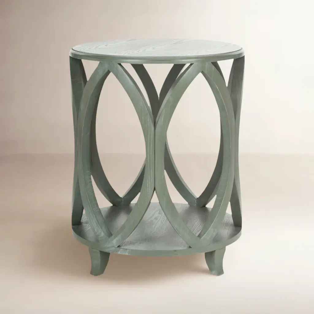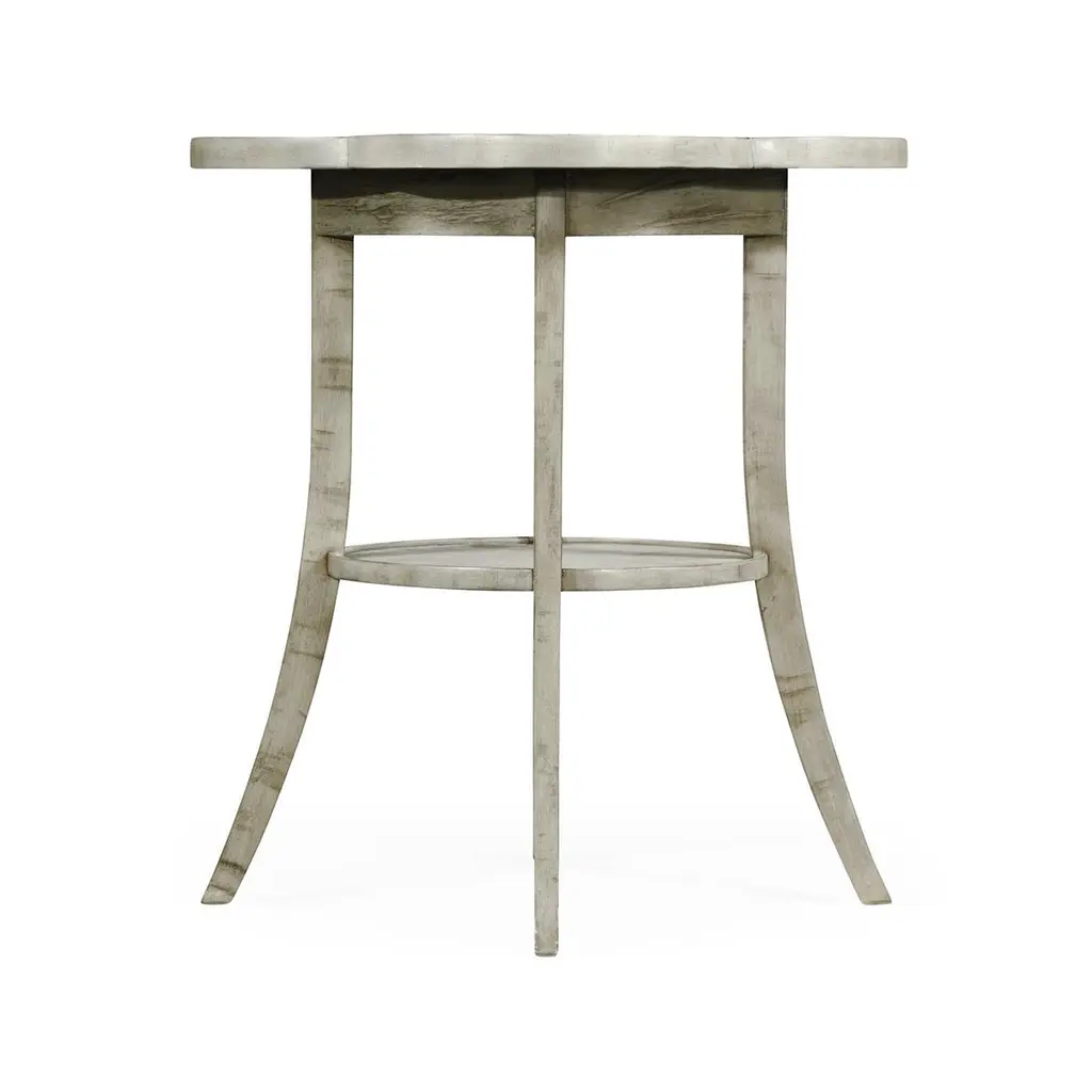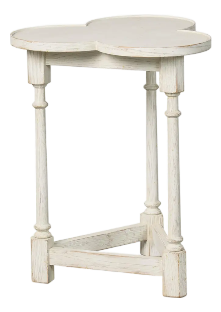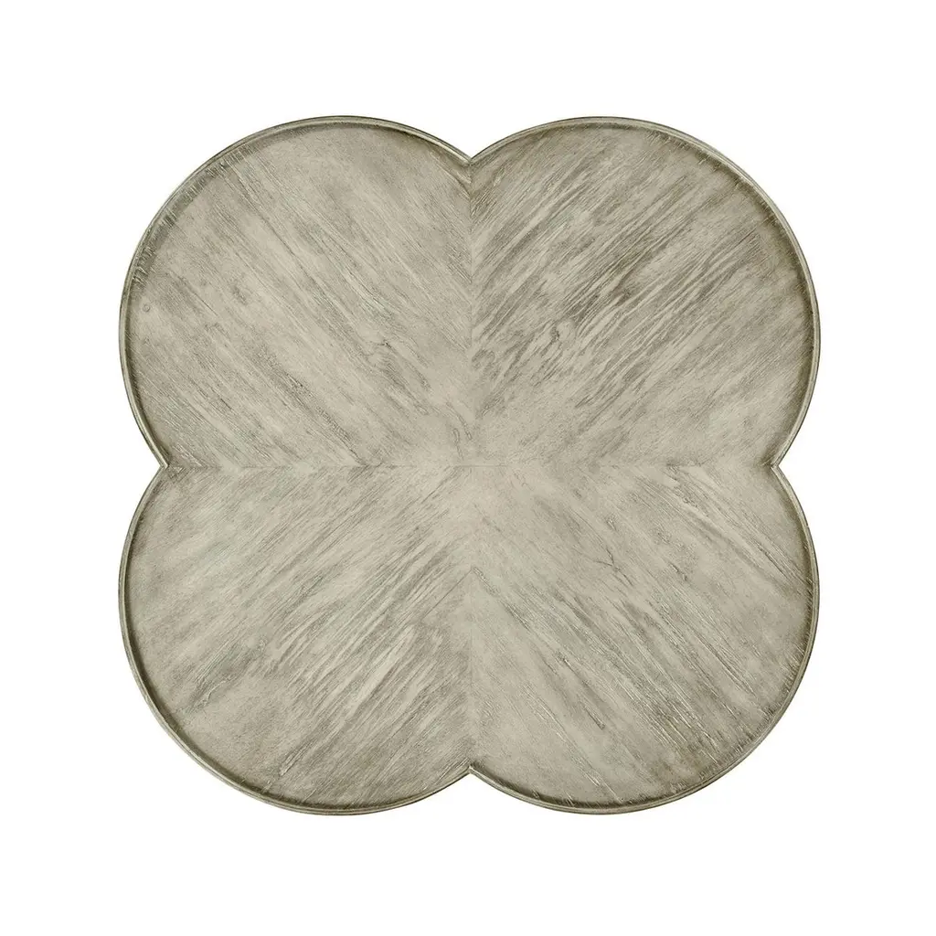 Designed with a timeless aesthetic, this table features a heavily distressed acacia wood construction that brings an air of rustic old-world charm to any room.The quatrefoil tabletop design adds a touch of elegance, while gracefully curved saber legs provide sturdy support. A lower round shelf offers additional space for storage or display, making this table as practical as it is sophisticated.Whether placed beside a sofa or as an accent piece in a cozy nook, this end table enhances the ambiance of your home with its artisanal craftsmanship and rustic grey finish. Perfect for displaying decorative accents, a warm lamp, or a cherished book, this end table is both functional and stylish, making it a must-have addition to any refined interior.Dimensions: 26" W x 26" D x 28" H