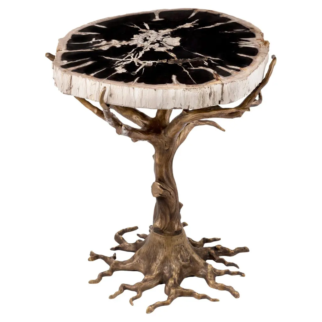 Elegant and unique, this coffee was crafted with nature in mind. The brass base has a dark-burnished finish and is masterfully handcrafted in the life-like shape of a tree. The polished top is a striking slice of white agate with a natural, organic shape that offers a lovely contrast with the rough texture of the base. Whether showcased in an entryway or living room, this statement round accent brings the best of both modern and rustic styles to the table. Size vary based on the agate sample available.