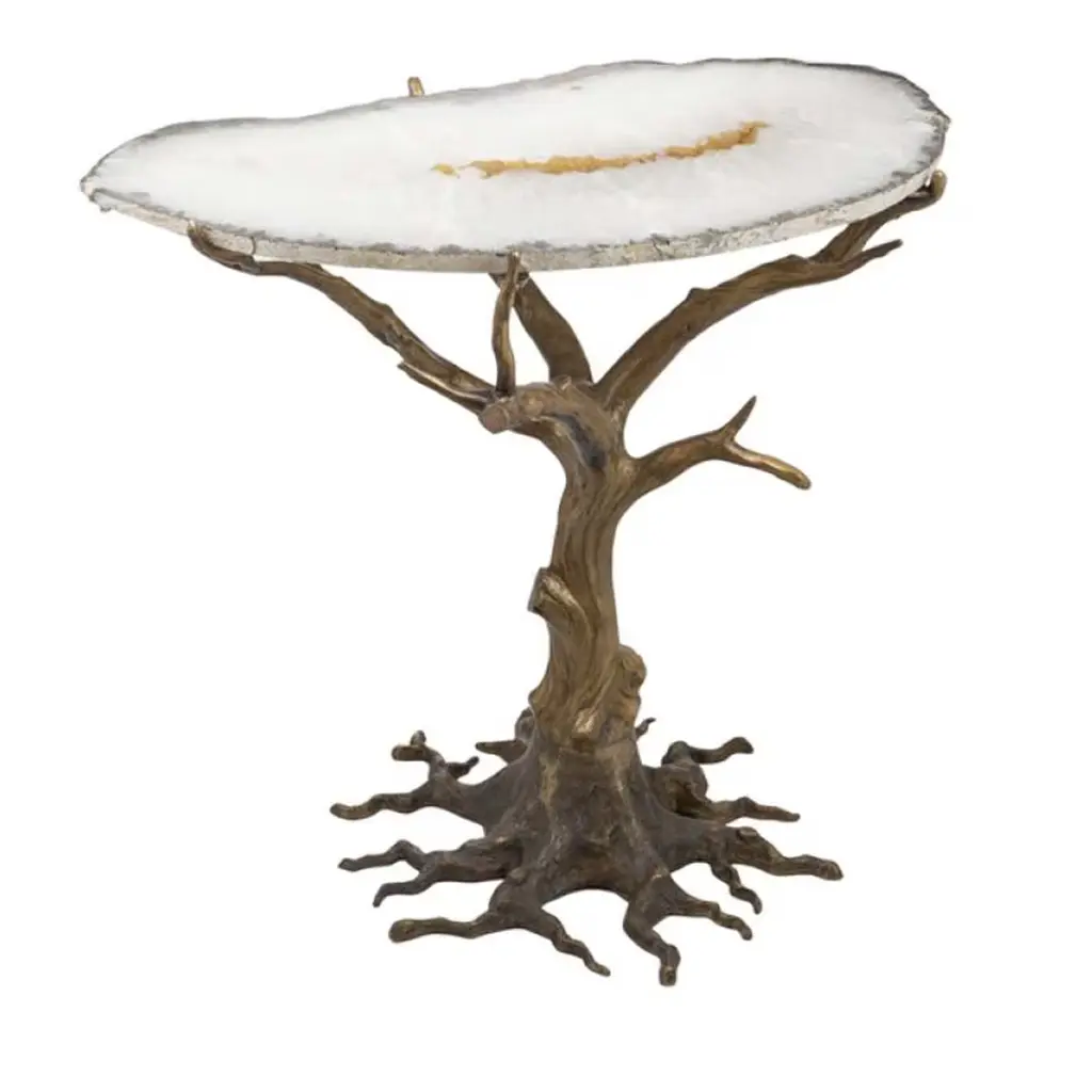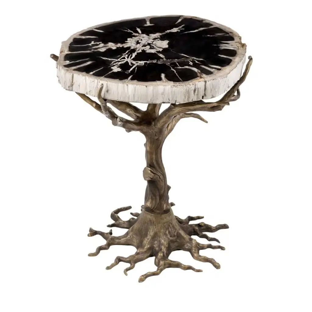 This sculptural table features a brass tree base with branches that support a round glass top. The dark-burnished finish of the brass and the irregular hand-engraved surface create a captivating combination. Placed near the sofa in a living room, as nightstand in a bedroom, or in an entryway, the nature-inspired silhouette of this table will create a stylish display surface adding a glamorous focal point in any decor.